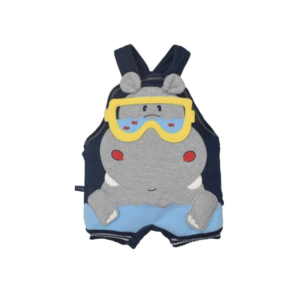Este conjunto para bebê menino na cor azul marinho é simplesmente encantador, com um toque divertido e moderno. Feito em malha denim, com 72% algodão e 28% poliéster, ele é resistente, confortável e perfeito para os dias de calor. O retilínea de algodão nas perninhas proporciona ainda mais suavidade. O destaque fica por conta do bordado de um hipopótamo estiloso, com seu visual moderno e adorável, que com certeza vai conquistar todos ao redor. Um amiguinho perfeito para o bebê, pronto para um "banho de mar" de fofura!