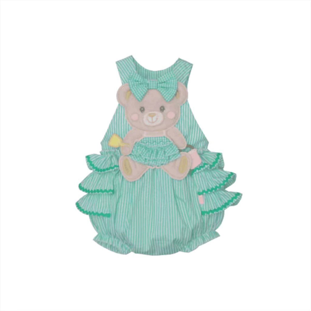 Este encantador banho de sol para bebê menina é a escolha perfeita para os dias quentes! Na cor verde com listras brancas, traz um visual delicado e charmoso. A estampa de uma adorável ursinha marrom com um laço verde adiciona um toque especial de fofura, enquanto os babados garantem ainda mais graciosidade. Feito em algodão leve, proporciona conforto e frescor para a pele sensível da sua pequena.