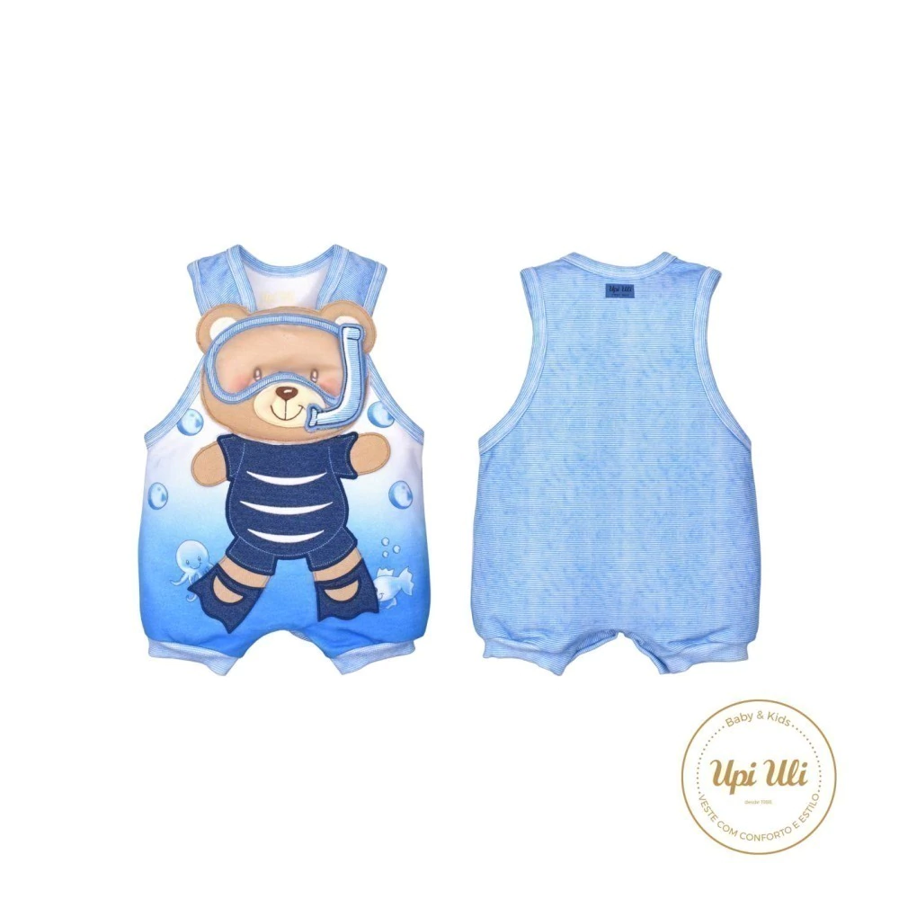 Banho de sol azul confeccionado em molecottom, um tecido macio e confortável que proporciona liberdade de movimento para os pequenos. O modelo conta com uma estampa digital encantadora e um delicado bordado frontal em 3D, trazendo charme e estilo à peça. Possui punho na perna para um ajuste mais aconchegante e fechamento prático por botões de pressão na alça e no fundo, facilitando na hora de vestir e trocar.