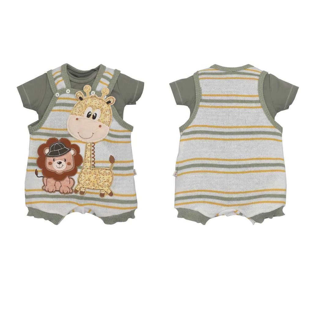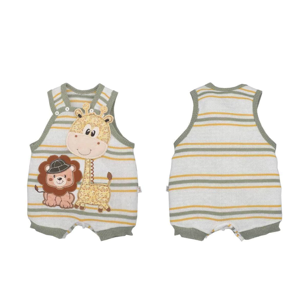 O Banho de Sol Safari com body é a escolha perfeita para os dias quentes, unindo conforto, maciez e um visual encantador. A jardineira em tricô listrado possui aplicação fofa de leão e girafa, tornando o look ainda mais divertido para o bebê.