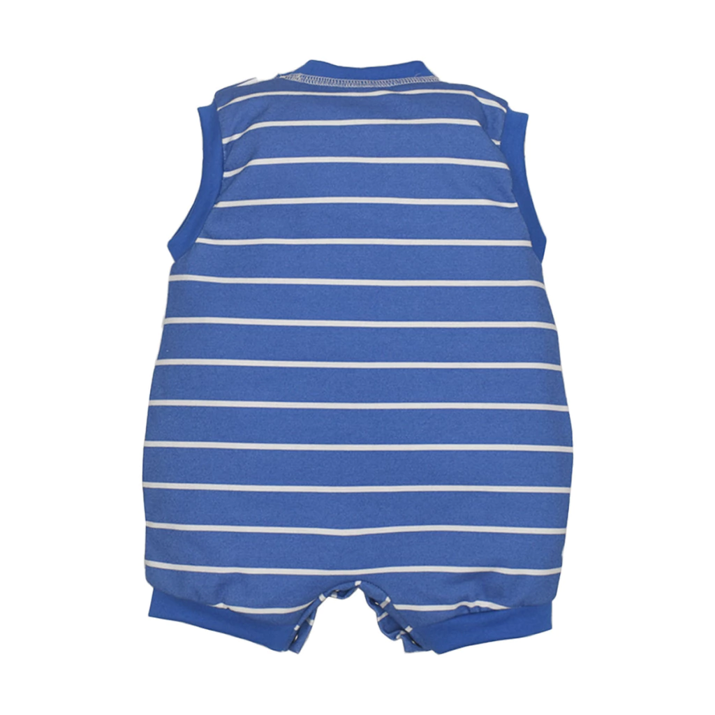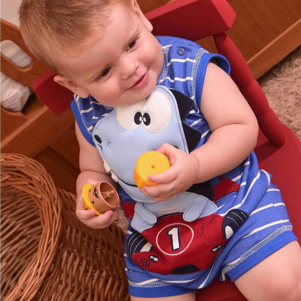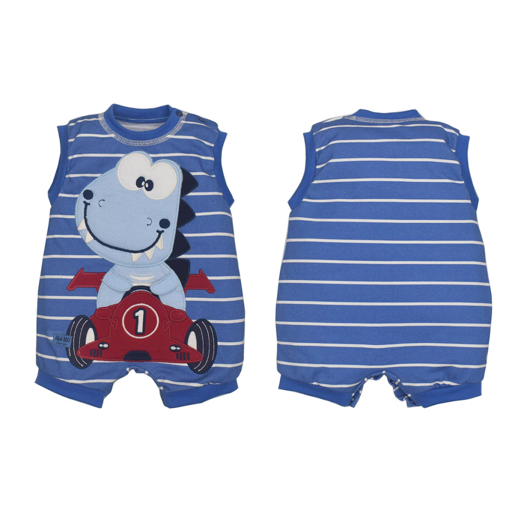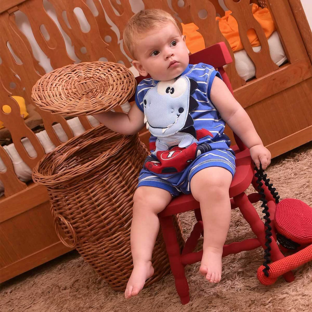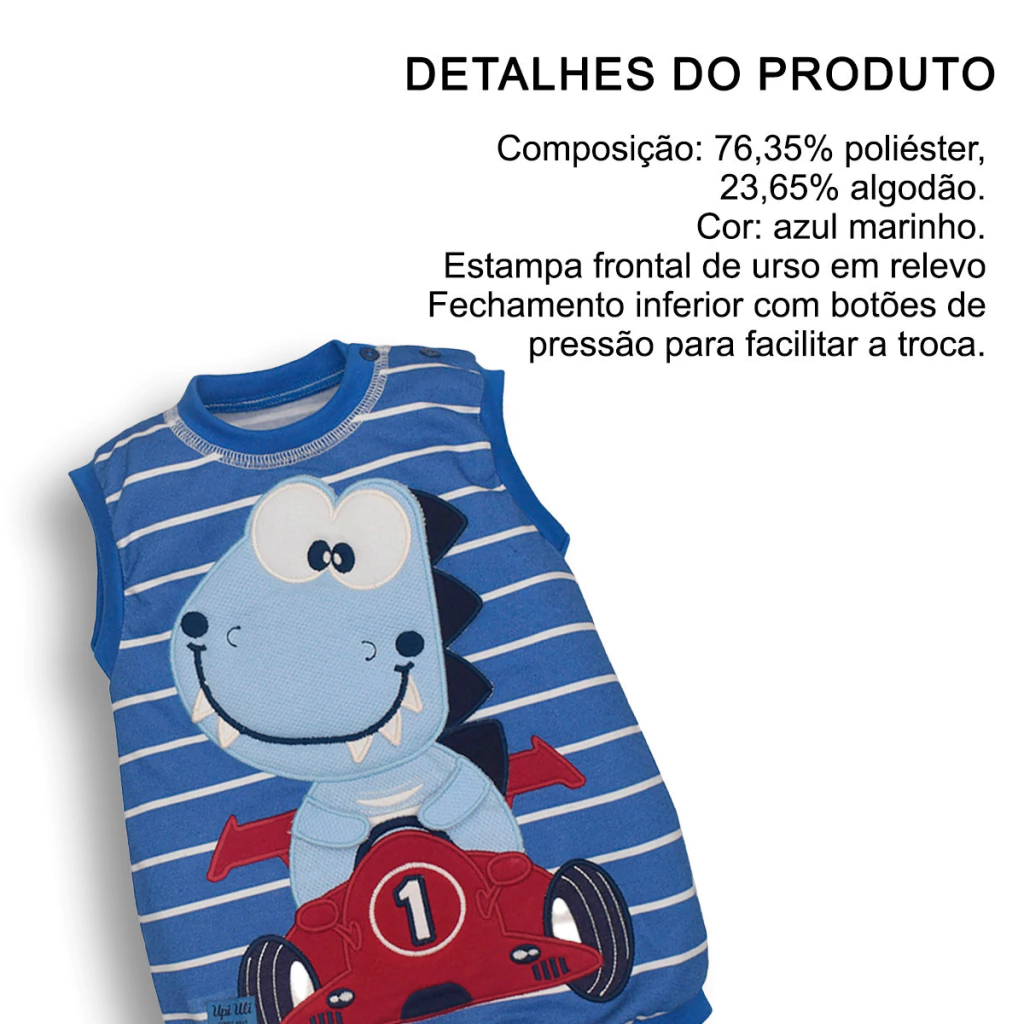 Banho de sol confeccionado em suedine macio, com design encantador em azul claro com listras azul escuro e estampa frontal de dinossauro, perfeito para o conforto e estilo do bebê nos dias mais quentes.