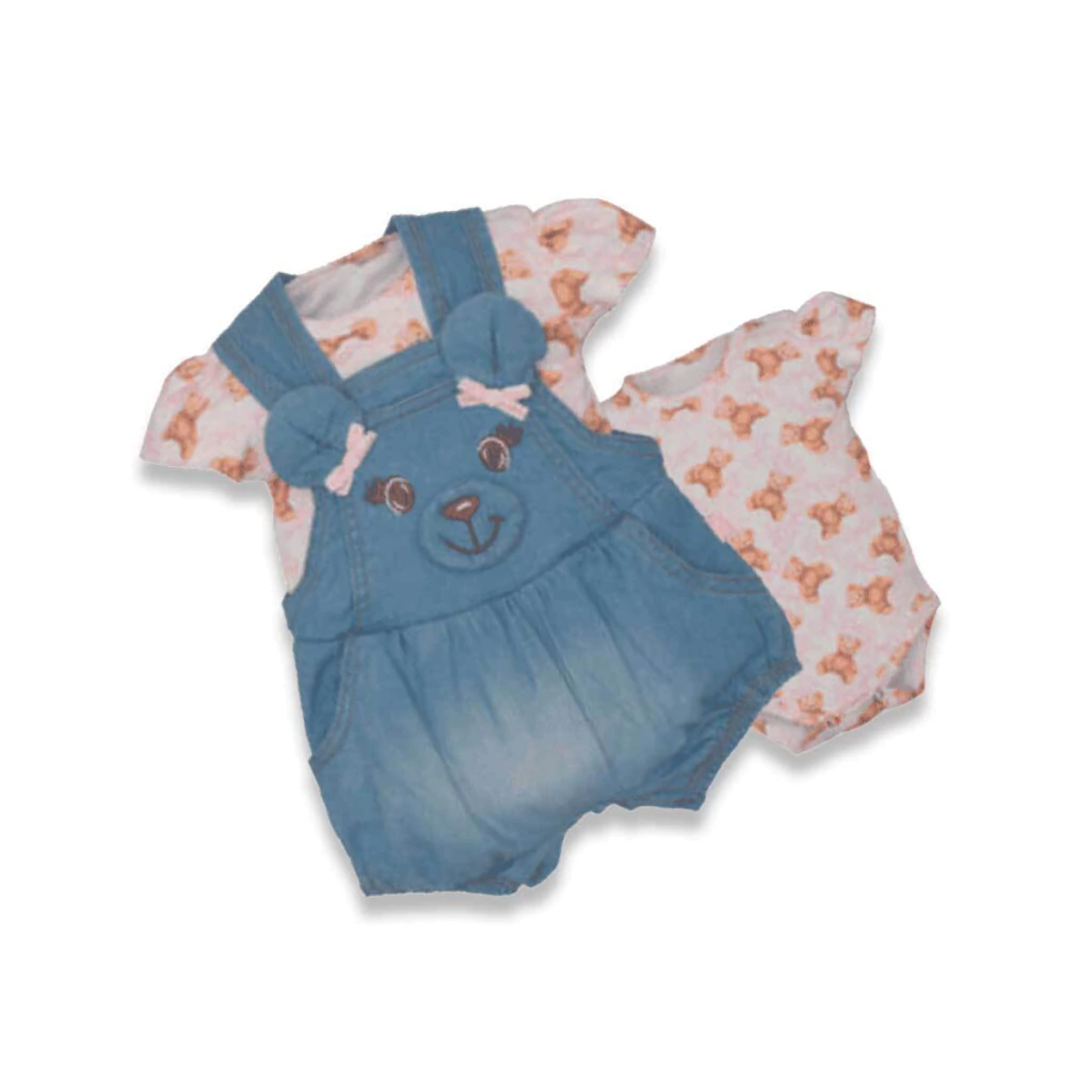 Este conjunto de banho de sol para bebê menina é a união perfeita entre conforto e delicadeza. A jardineira em jeans leve azul traz um toque moderno e conta com um bordado de ursinho na parte frontal, com orelhinhas em relevo e laços rosa para um charme extra. Para completar o look, acompanha um body branco com estampa de ursinhos, garantindo praticidade e um visual encantador.