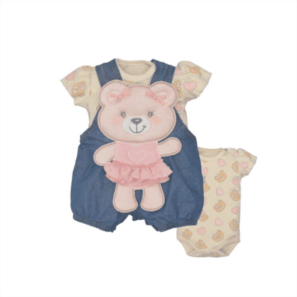 Este encantador conjunto é perfeito para manter seu bebê confortável e estiloso durante os dias quentes. O banho de sol em jeans é macio e confortável, apresentando um adorável bordado de ursinha na parte frontal. Com abertura no fundo e nas alças, e fechamento em botão de pressão, ele é prático para vestir. O body em suedine possui uma estampa digital de ursinhas em flocagem, garantindo um visual adorável.