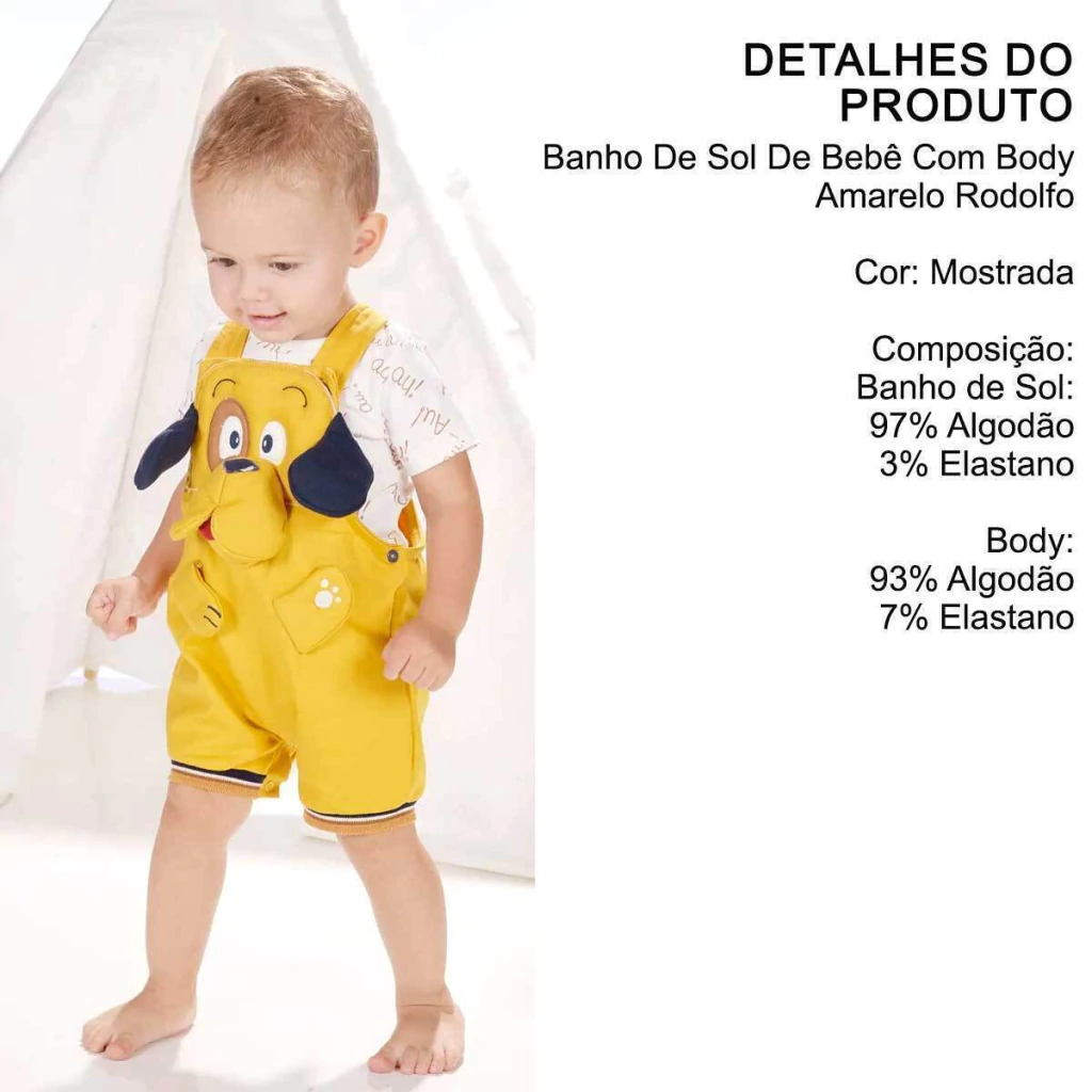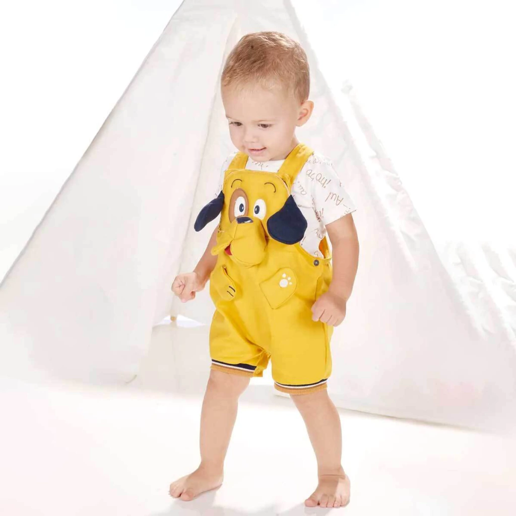 O doguinho Rodolfo chegou com muita alegria para acompanhar o seu bebê nos dias quentes! Esse conjunto encantador é composto por uma jardineira estilo banho de sol amarelo ouro e um body superconfortável com estampa “Au Au Au” feita em toque zero. O destaque vai para o bordado em alto relevo com carinha do cachorro, além dos detalhes interativos: orelhinhas, focinho, patinhas e rabinho que se mexem! Ideal para deixar seu baby boy ainda mais fofo e animado.
