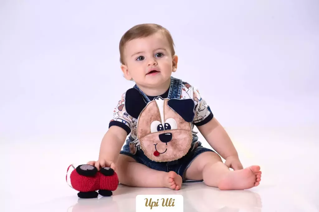 Banho de sol em jeans com elastano, macio e confortável, com bordado de cachorrinho 3d frontal.