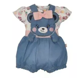 Banho de sol em jeans com elastano, macio e confortável, com bordado de ursinha frontal com laço 3d.