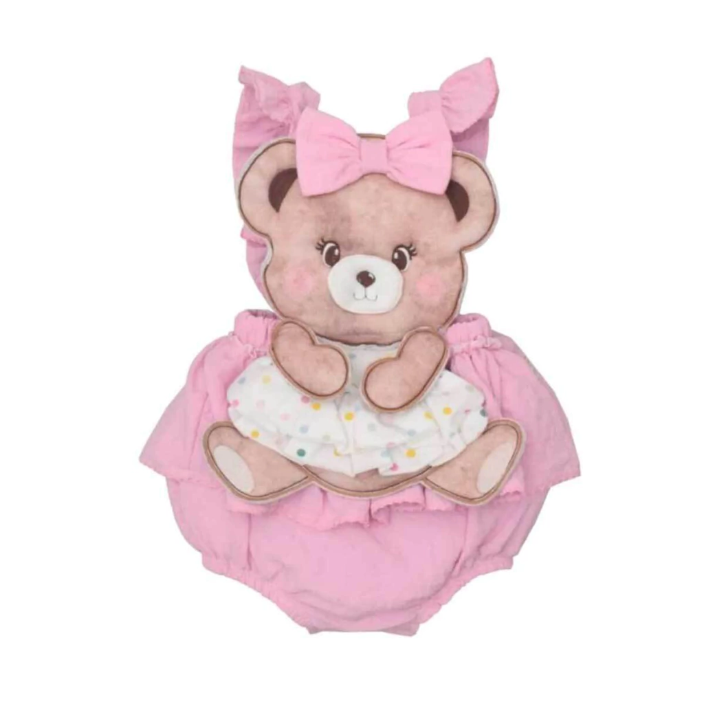Banho de sol tecido anarruga, macio e confortável, com babadinhos nas alças, com bordado 3d de ursinha.
