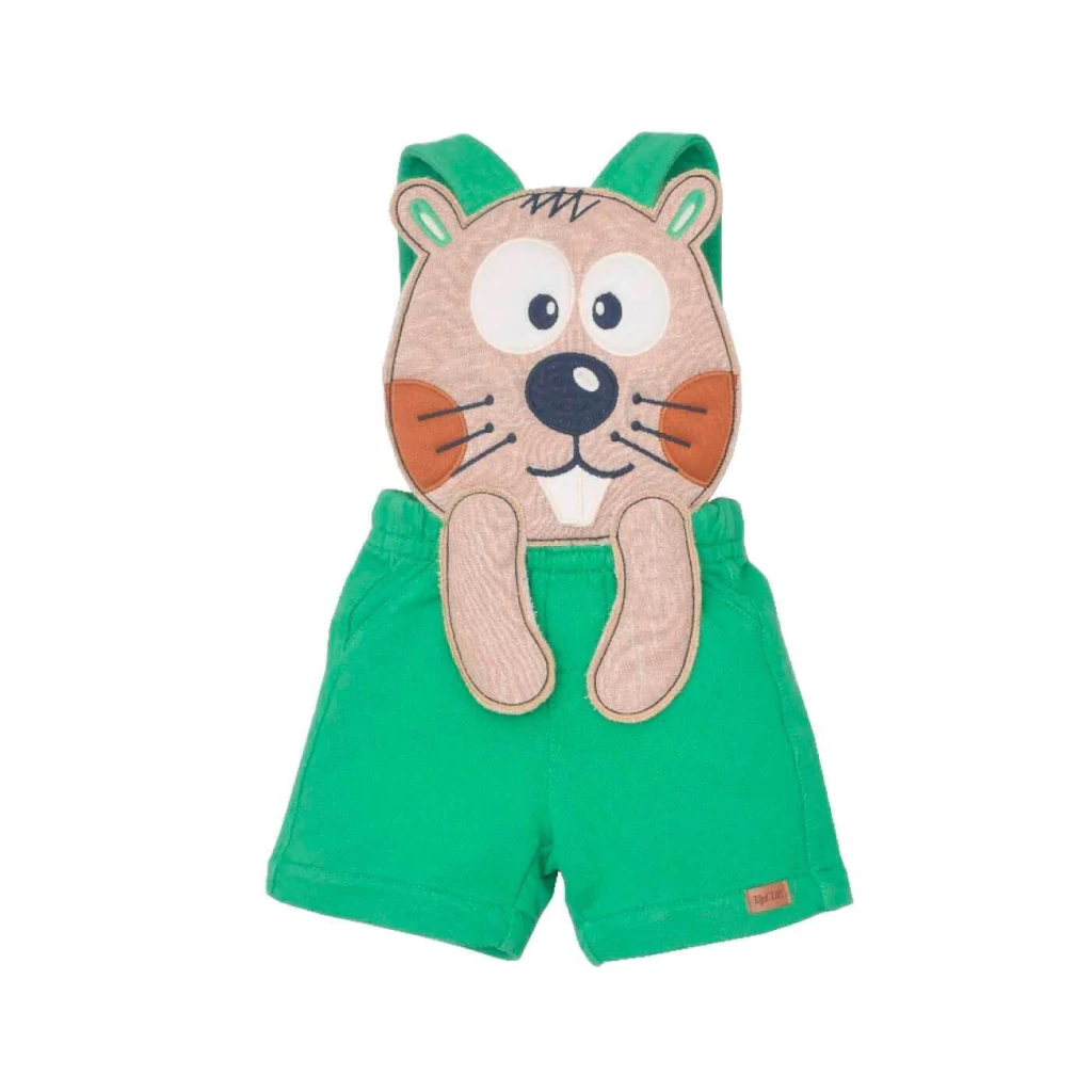 O modelinho é composto por jardineira em moletom verde e bordado em relevo fofinho...