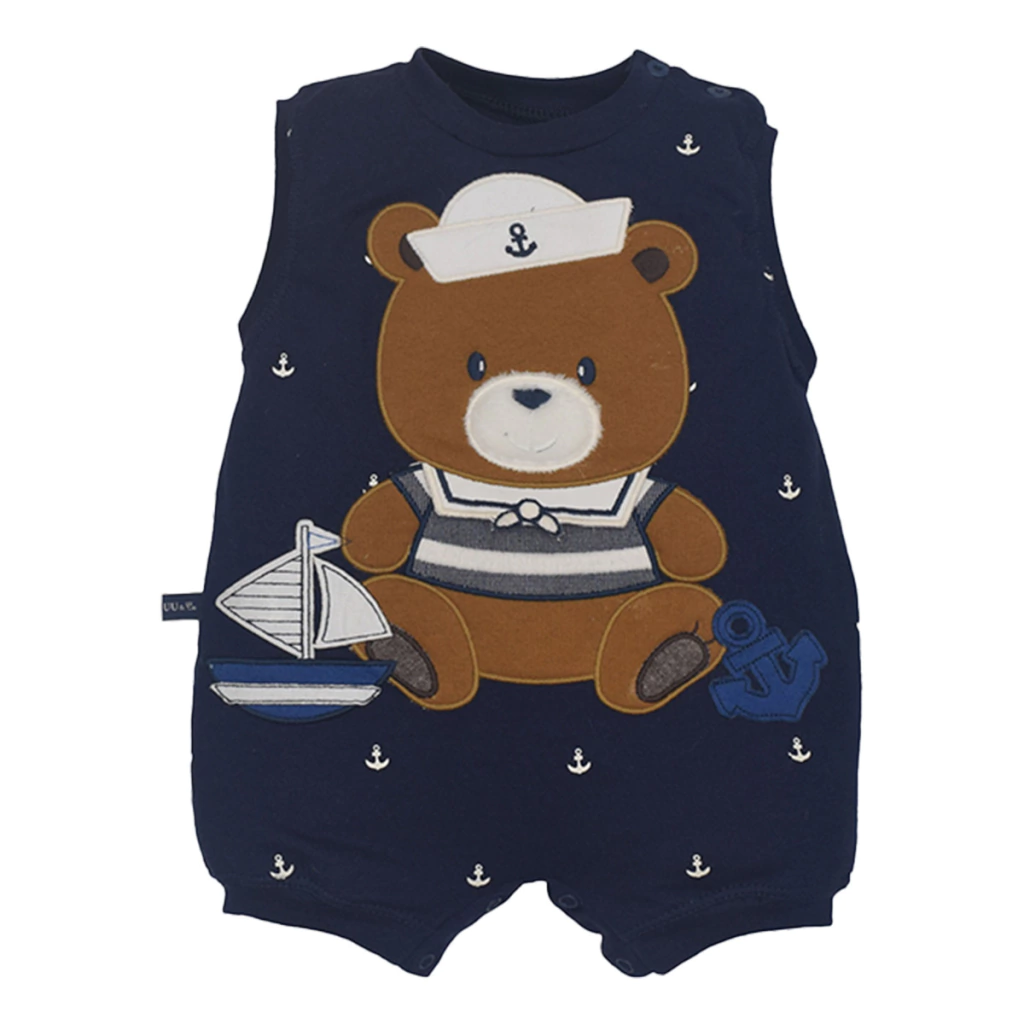 Banho de sol macaquinho para bebê menino, confeccionado em piquet premium com 95% algodão e 5% elastano, garantindo excelente conforto e leveza para os dias mais quentes. A peça na cor azul marinho possui mangas curtas, ideais para o verão, e um encantador detalhe de estampa frontal de ursinho com temática náutica, trazendo um toque descontraído e charmoso.