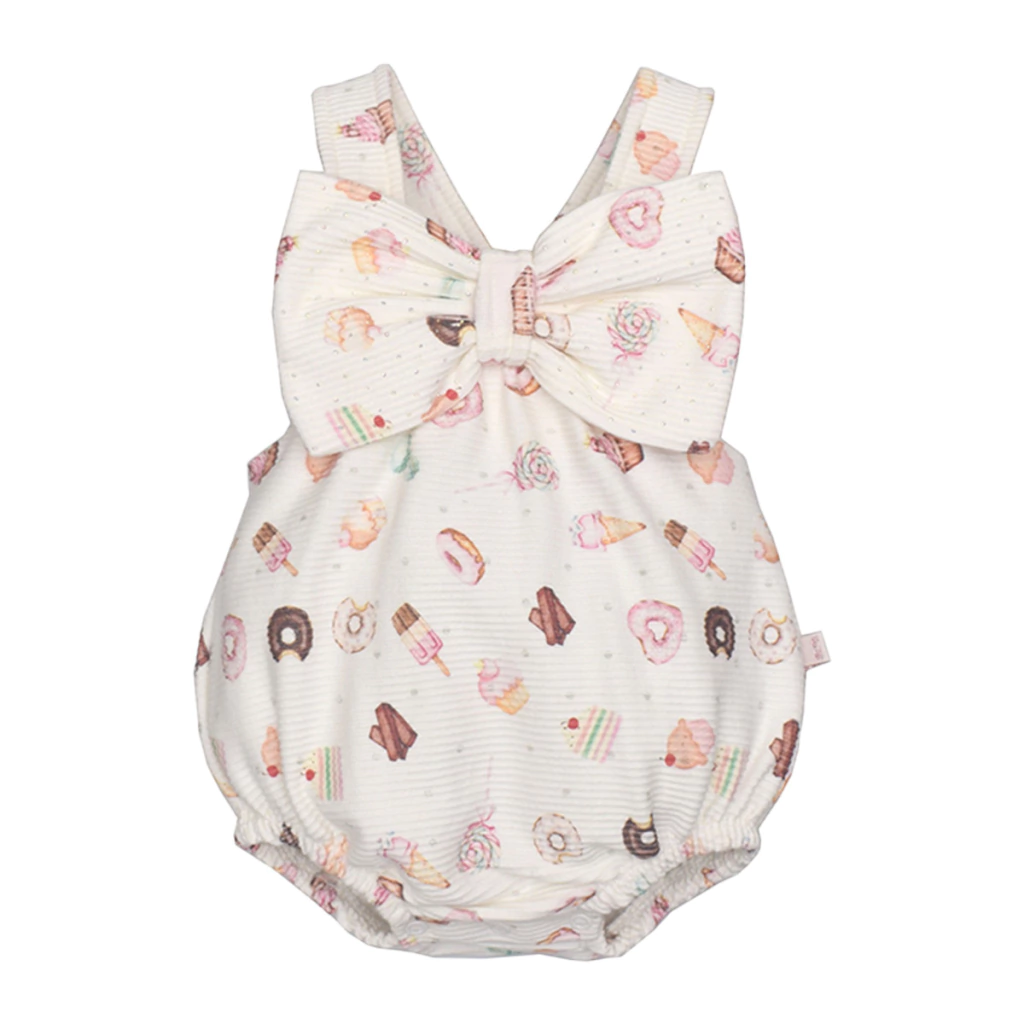 Banho de sol modelo macaquinho para bebê menina, confeccionado em malha canelada com 97% algodão e 3% elastano, garantindo maciez e flexibilidade. A peça branca apresenta um delicado laço frontal e encantadoras estampas de doces, trazendo um visual divertido e delicado, ideal para os dias de calor.