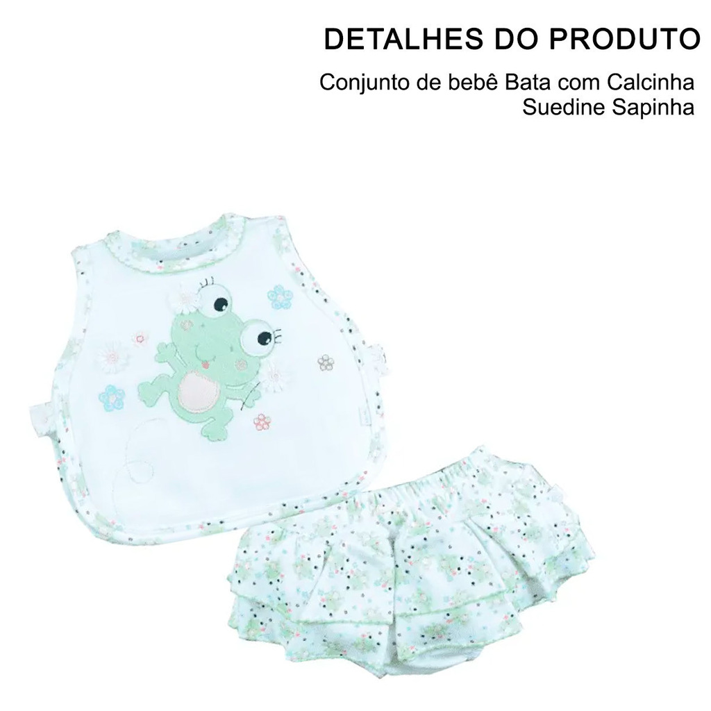 Fofura e frescor para os dias ensolarados! Este adorável conjunto verde claro vai encantar com sua delicadeza e conforto. A bata é confeccionada em 100% algodão e possui um lindo bordado frontal de sapinha, adicionando um toque divertido e carinhoso ao visual. O tapa fralda acompanha o mesmo tom da bata e vem com uma estampa floral suave, perfeita para completar o look com charme e leveza. Uma combinação ideal para momentos de lazer ou passeios com a sua pequena.