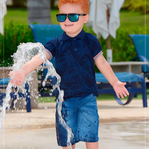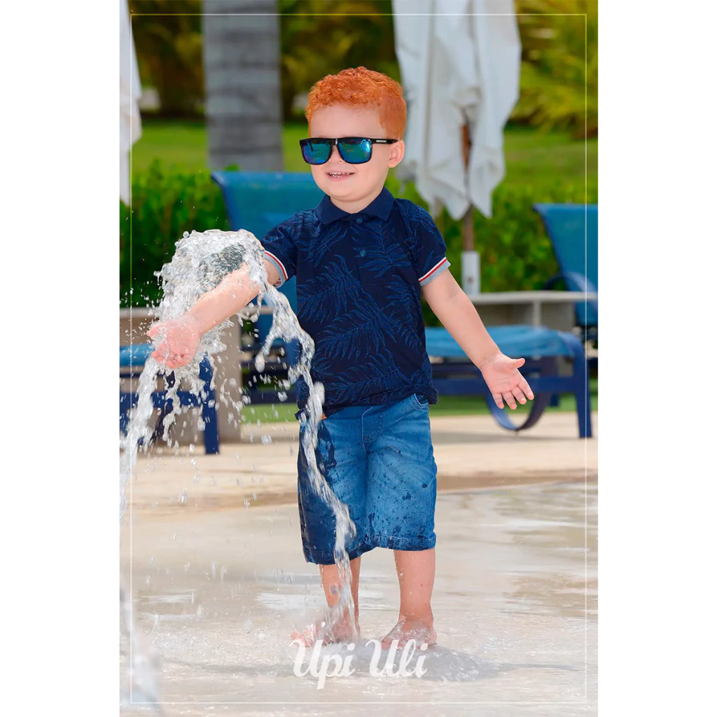 Um look cheio de charme e liberdade para os pequenos curtirem os dias mais quentes com muito estilo! Este conjunto infantil combina uma polo azul marinho com estampa em tom índigo e bermuda jeans confortável com lavagem moderna. A camisa traz detalhes retilíneos na gola e mangas, deixando o visual ainda mais moderno e arrumadinho. A bermuda com elastano garante mobilidade para acompanhar toda a energia da criançada.