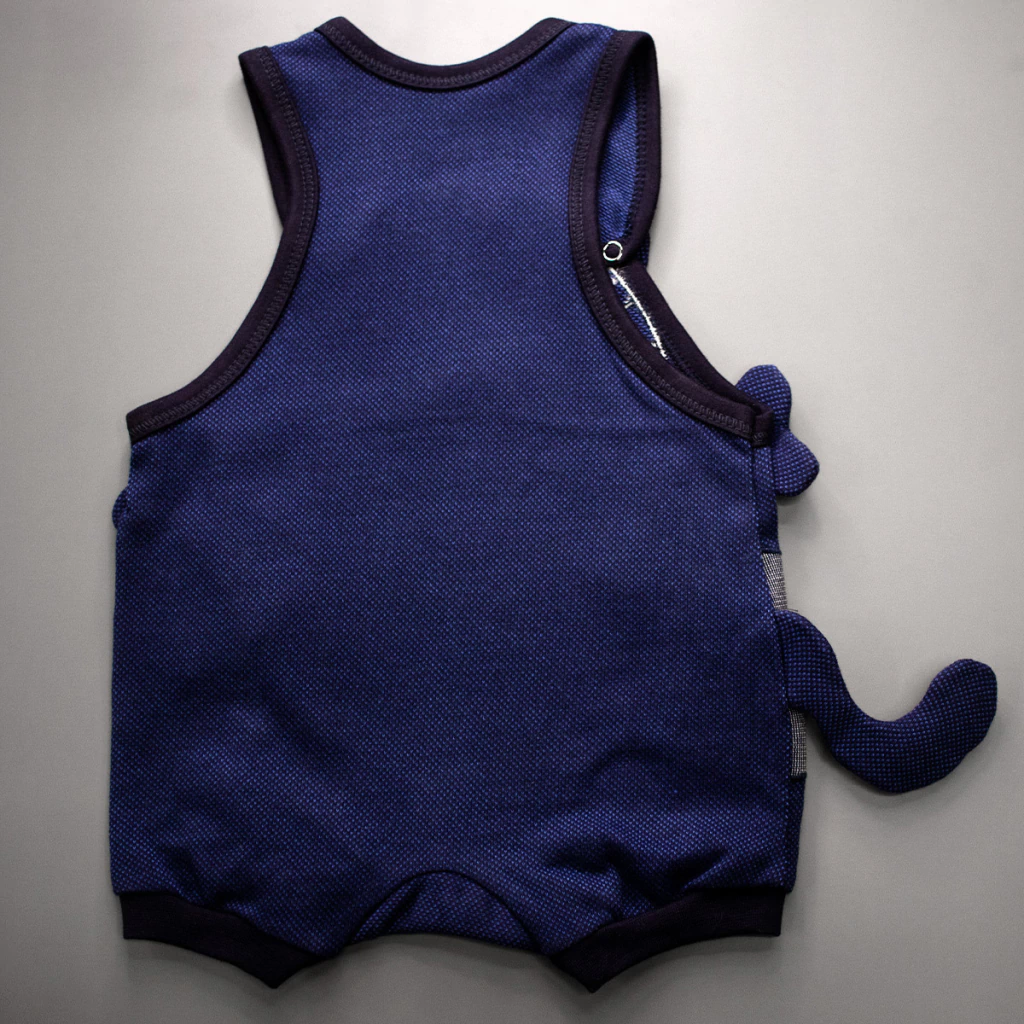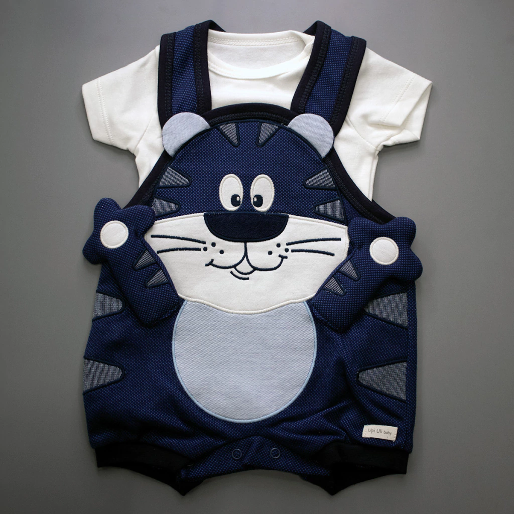Conjunto composto por banho de sol em piquet azul marinho com suspensório e estampa de tigre, acompanhado de um body branco em suedine. Uma combinação charmosa e confortável para o dia a dia do seu bebê.
