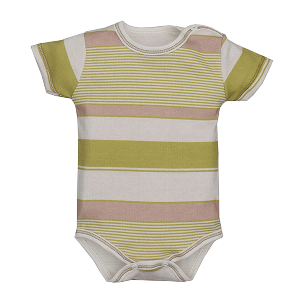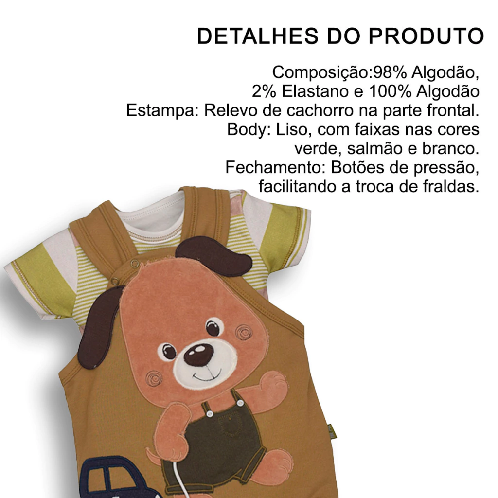 Banho de sol e body para bebê menino, confeccionado em pique de algodão com elastano e suedine, ambos trazendo conforto e estilo para os dias quentes. O banho de sol bege possui uma estampa frontal de cachorro com relevo, enquanto o body é liso, com faixas nas cores verde, salmão e branco, criando uma combinação charmosa e moderna.
