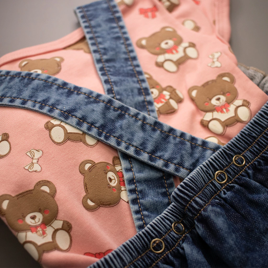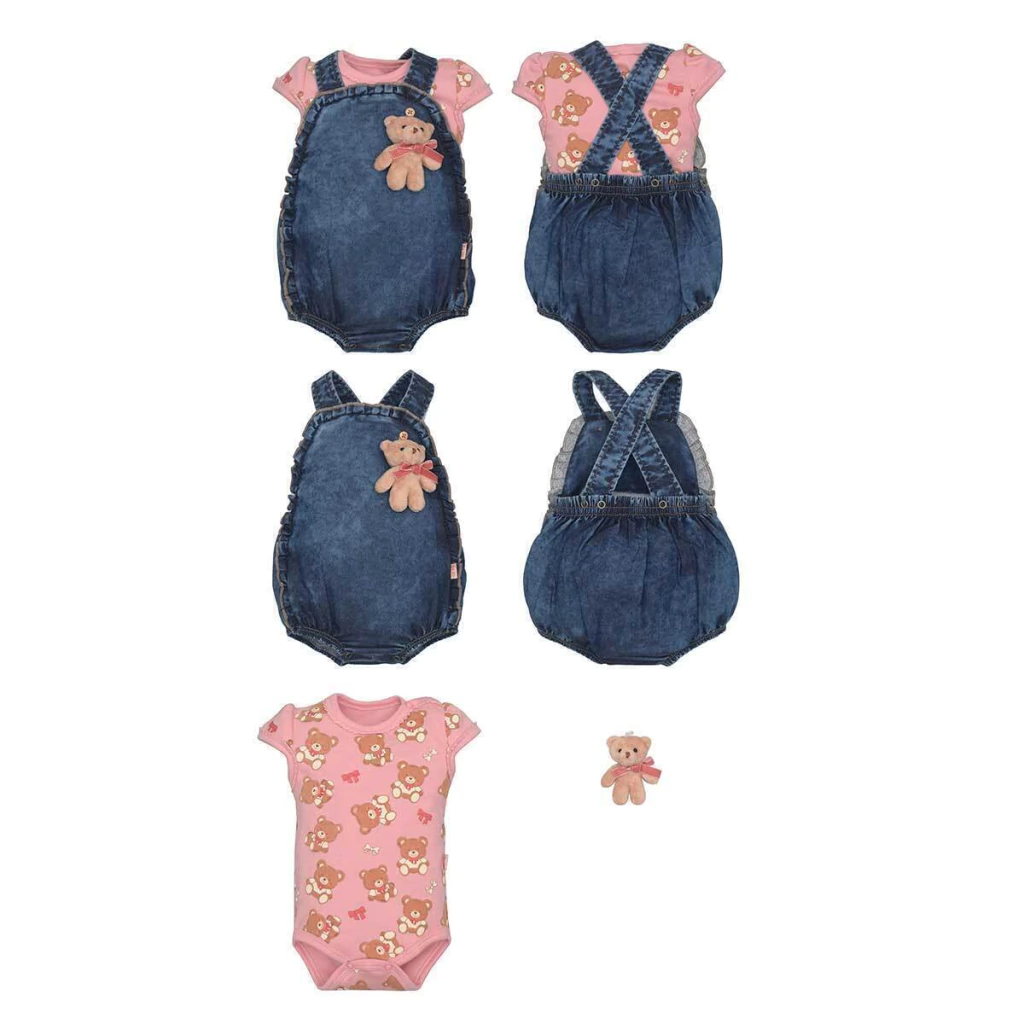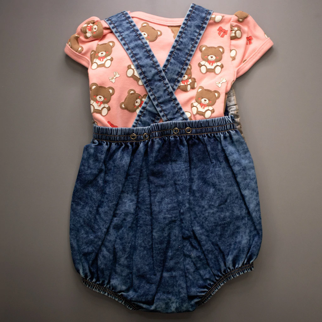 Conjunto composto por banho de sol jeans com suspensório e body rosa em algodão com estampa delicada de ursos e laços. Perfeito para trazer charme e conforto aos dias mais quentes.
