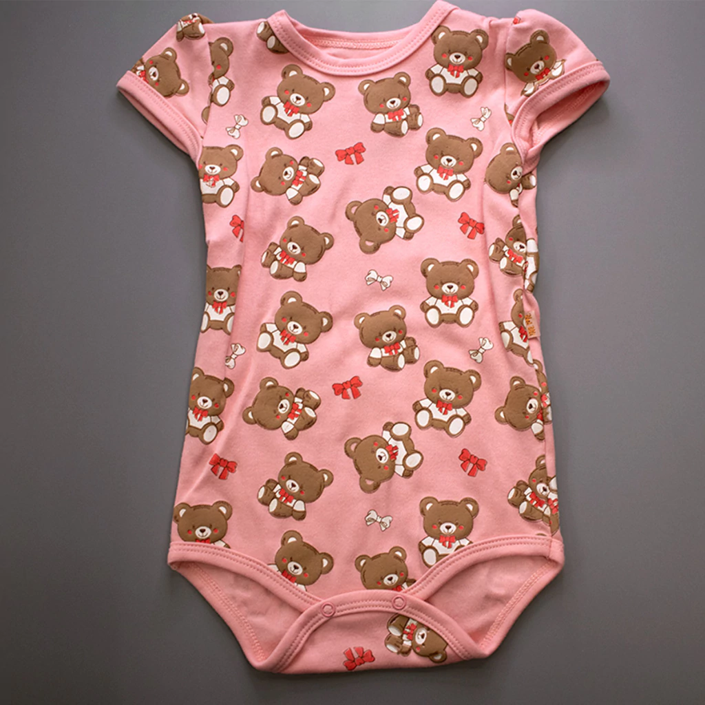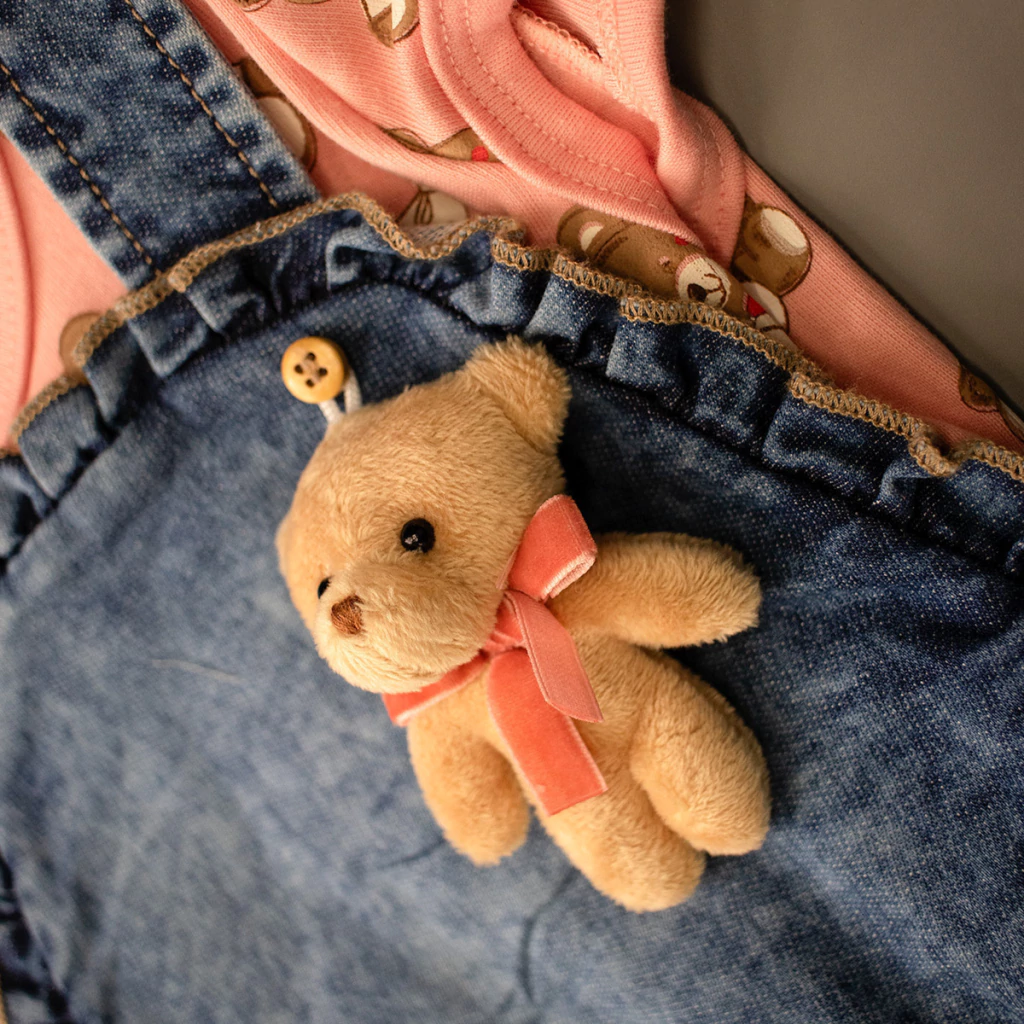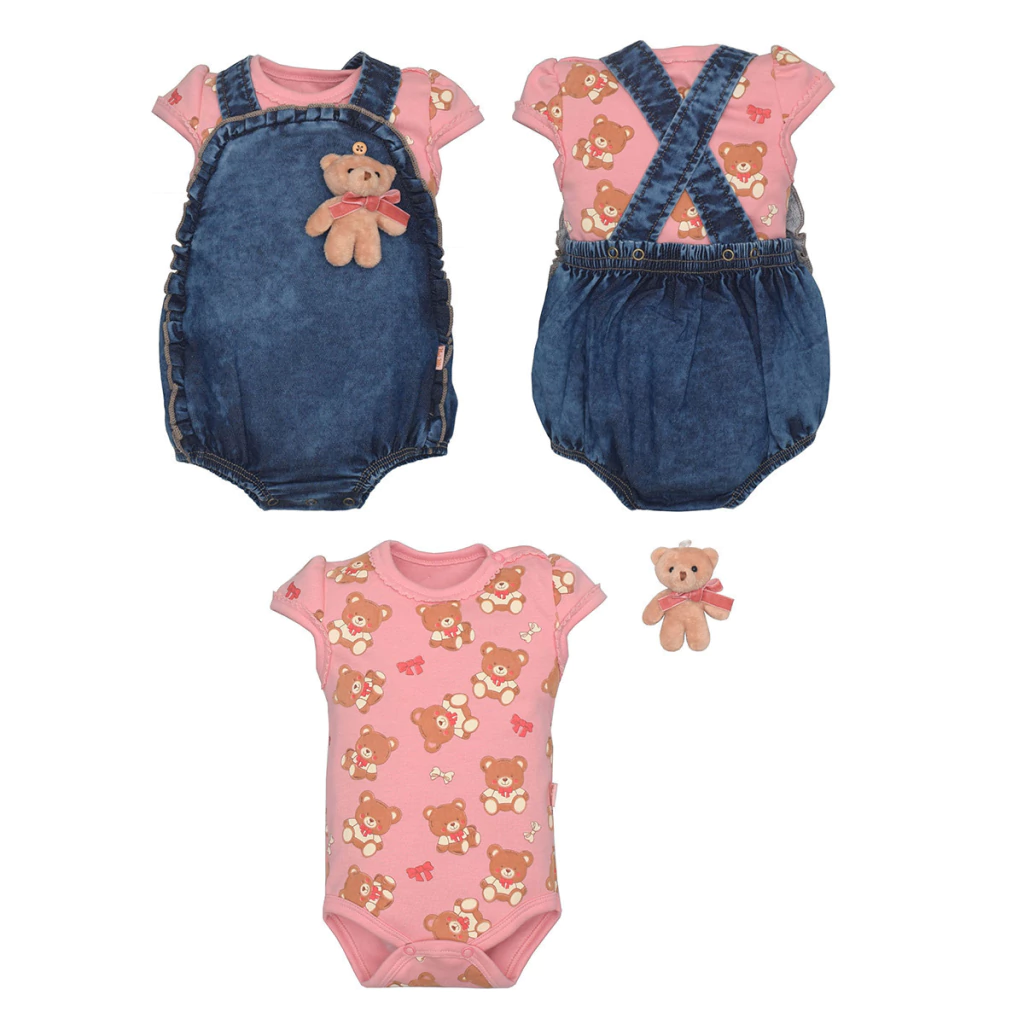 Conjunto composto por banho de sol jeans com suspensório e body rosa em algodão com estampa delicada de ursos e laços. Perfeito para trazer charme e conforto aos dias mais quentes.