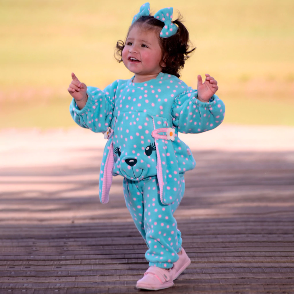 Esse conjunto em microsoft oferece máximo conforto e aconchego, ideal para os dias mais frios. A estampa rotativa de bolinhas e o bordado frontal adicionam um toque charmoso ao visual.