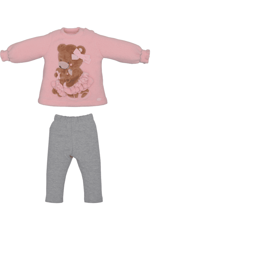 Este conjunto é perfeito para as pequenas que adoram um toque de fofura e conforto. Com uma blusa em pelúcia super macia e bordado encantador de ursinhas com laço de veludo, ele combina delicadeza e aconchego para os dias frios. A calça em moletom complementa o look, garantindo liberdade de movimento e conforto o dia todo.