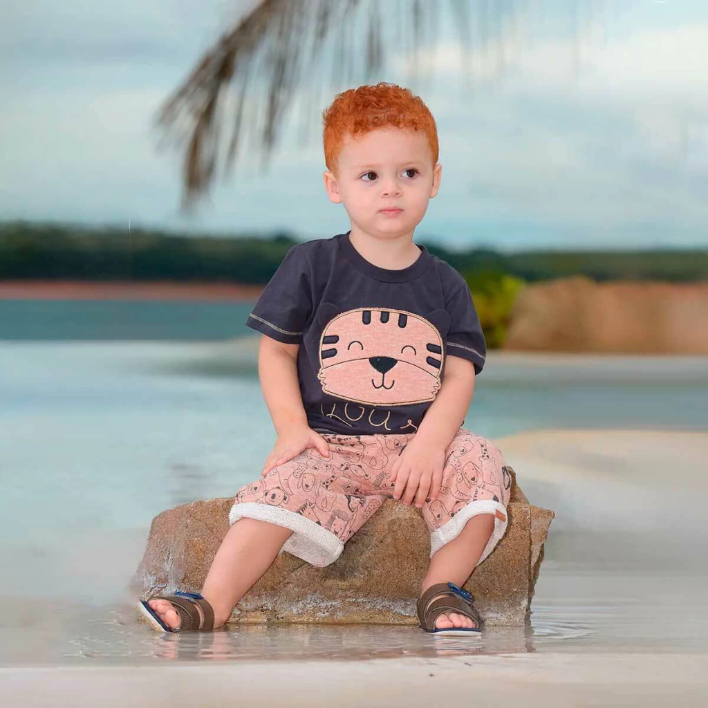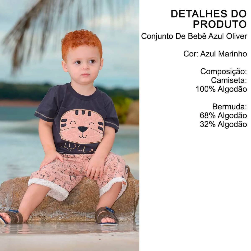 Com muito estilo e conforto, o Conjunto Azul Oliver é a escolha ideal para os meninos aproveitarem os dias mais quentes com liberdade e charme. A camiseta em malha macia traz um simpático tigre em bordado alto relevo, enquanto a bermuda em moletom leve completa o visual com estampa safari super moderna.