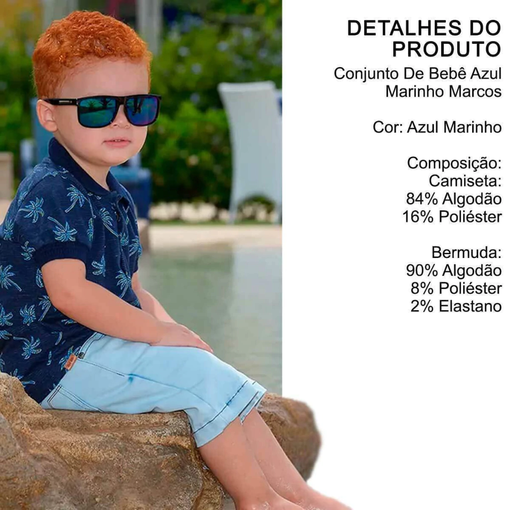 O look perfeito para os baby boys arrasarem nos dias quentes! O Conjunto Azul Marinho Marcos combina estilo, conforto e um toque moderno, com camiseta tipo polo toda estampada e bermuda jeans leve com caimento impecável. Ideal para passeios cheios de charme!