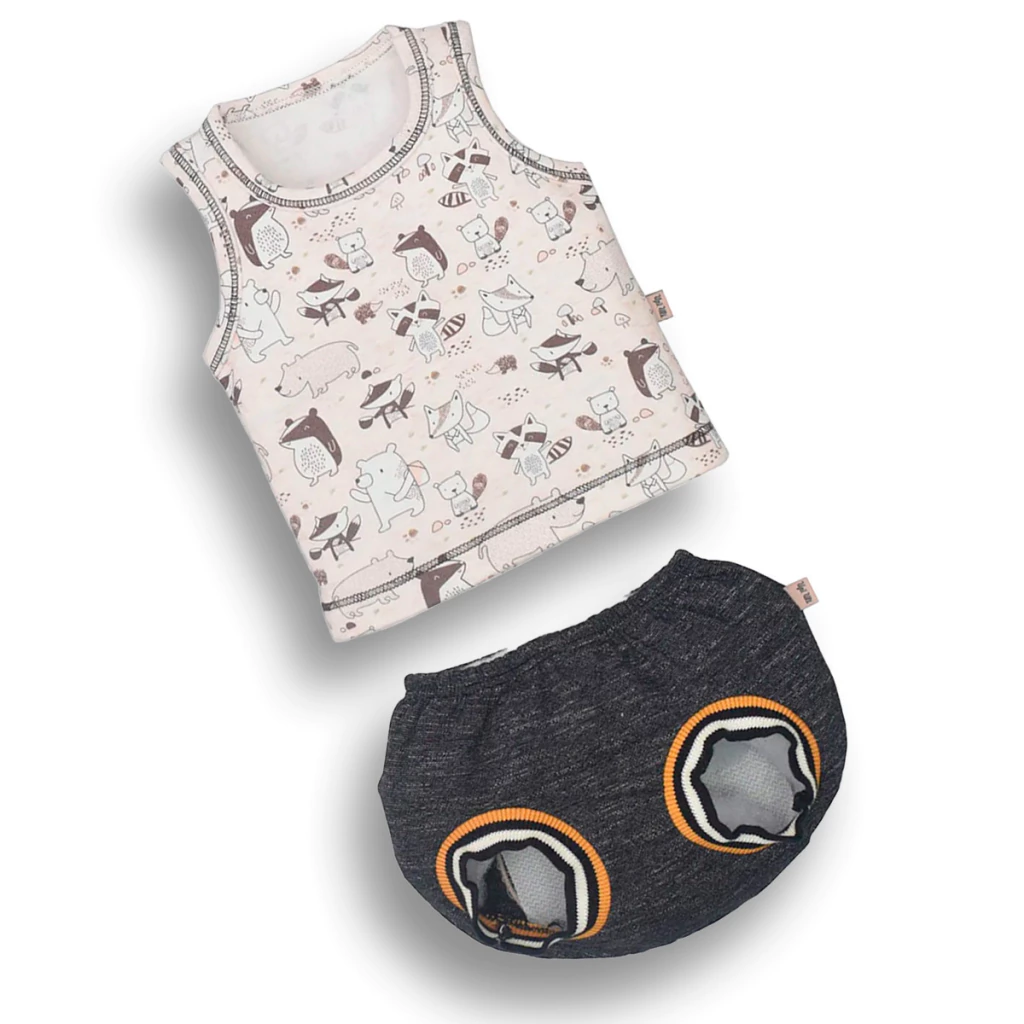 Estilo e conforto para dias quentes! Esse kit encantador é perfeito para os dias de calor, oferecendo praticidade e fofura para o bebê. A regata bege é estampada com esquilos e ursos em tons suaves, trazendo um visual divertido e delicado. Acompanha dois tapa fraldas: um em azul preto liso, clássico e versátil, e outro na cor preta com um bordado super fofo de esquilo, que adiciona charme ao look. As peças são leves, fresquinhas e ideais para o dia a dia.