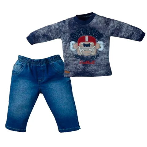 Um look cheio de personalidade para os pequenos aventureiros! O conjunto Bulldogs da Upi Uli traz estilo e conforto para o dia a dia do bebê, com estampa divertida e jeans macio.