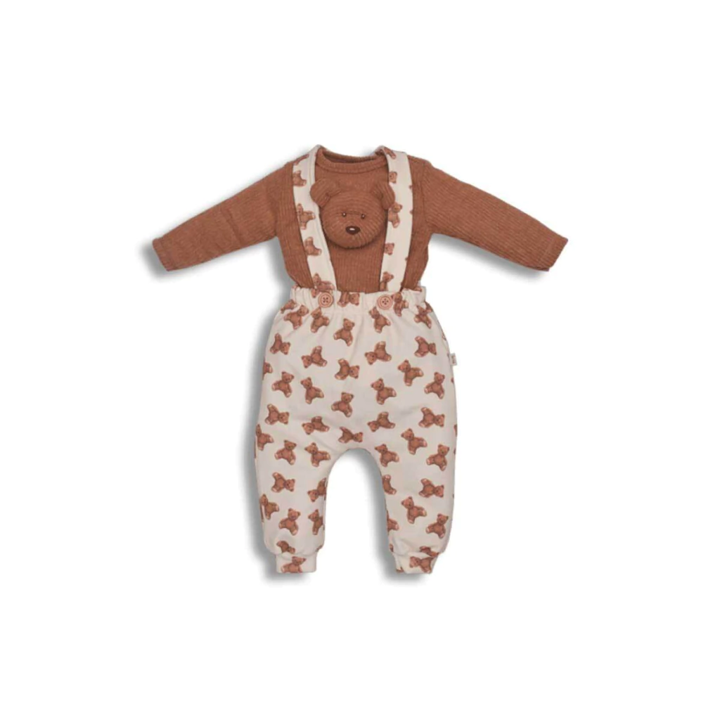 Este conjunto combina charme e praticidade para o dia a dia do bebê, proporcionando conforto sem abrir mão do estilo. O body em malha canelada possui um toque suave e um adorável patch de ursinho na frente. O culote, confeccionado em molecotom, traz uma estampa digital encantadora de ursinhos e um suspensório regulável e removível, permitindo diferentes formas de uso.