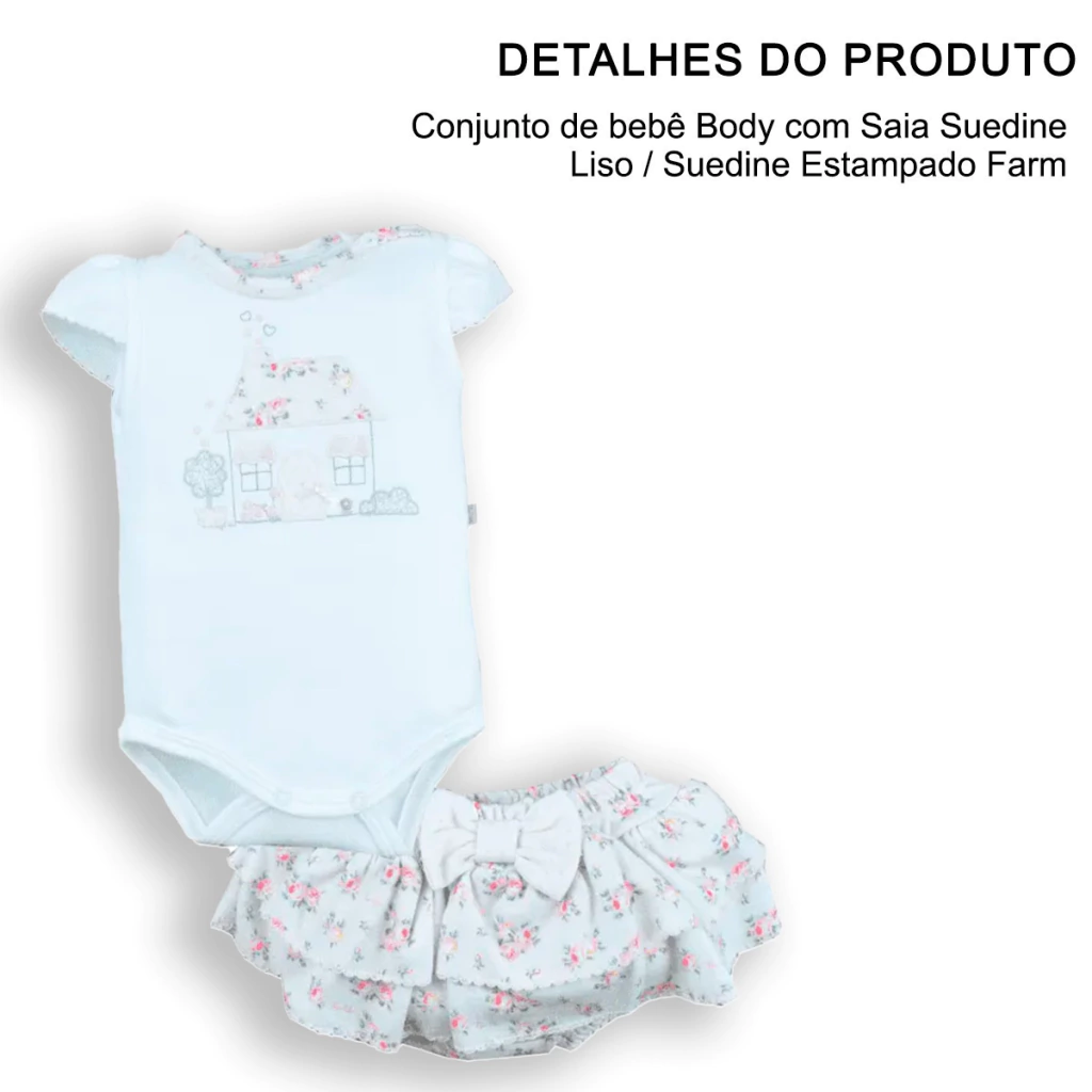 Este conjunto encantador é perfeito para deixar sua bebê ainda mais fofa e confortável! O body azul claro apresenta uma estampa delicada de casinha, trazendo um toque de charme e feminilidade. A saia com babados possui estampa floral e um laço frontal, adicionando um detalhe especial à peça. Confeccionado em 100% algodão, o conjunto proporciona maciez e conforto para a pele sensível do bebê, sendo ideal para o dia a dia ou ocasiões especiais.