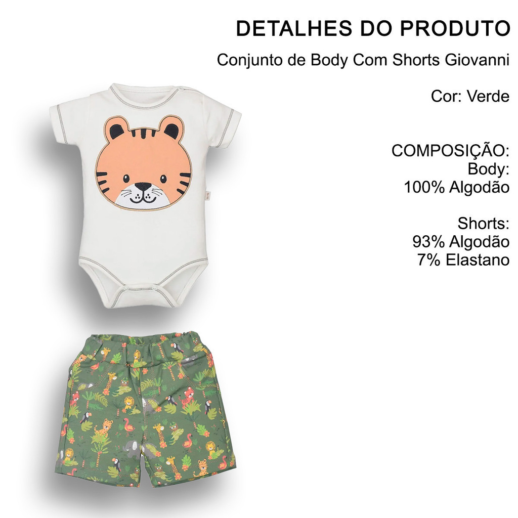 Estilo e conforto para as aventuras do dia a dia! O Conjunto Giovanni traz um look moderno e fresquinho, perfeito para os dias mais quentes. O body em suedine marfim encanta com o bordado delicado de tigrinho no peito, além de ser super macio e confortável para a pele sensível do bebê. Já o shorts em sarja verde com elastano, estampado digitalmente, tem elástico no cós para facilitar o vestir e garantir liberdade nos movimentos. Um visual cheio de charme e praticidade!