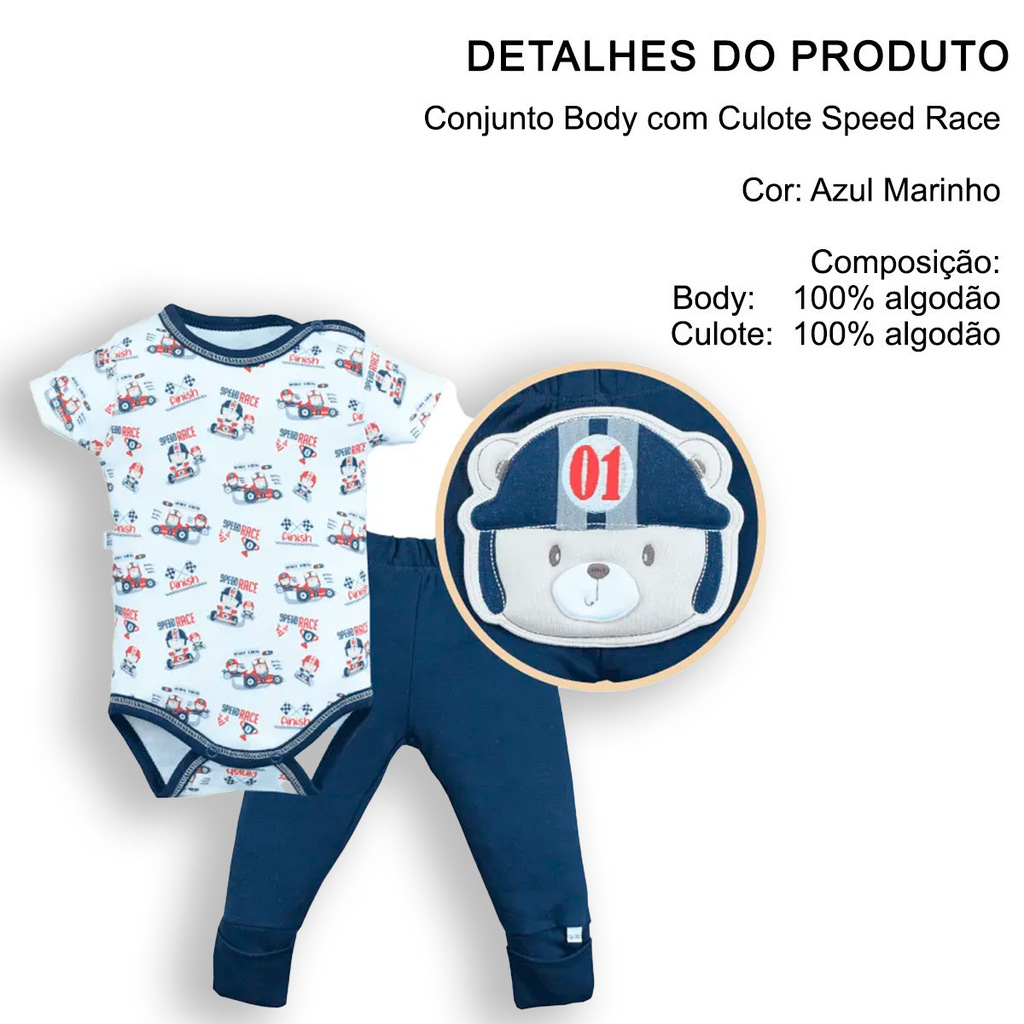 Escolha o Conjunto Body com Culote Speed Race para um look confortável e cheio de personalidade.