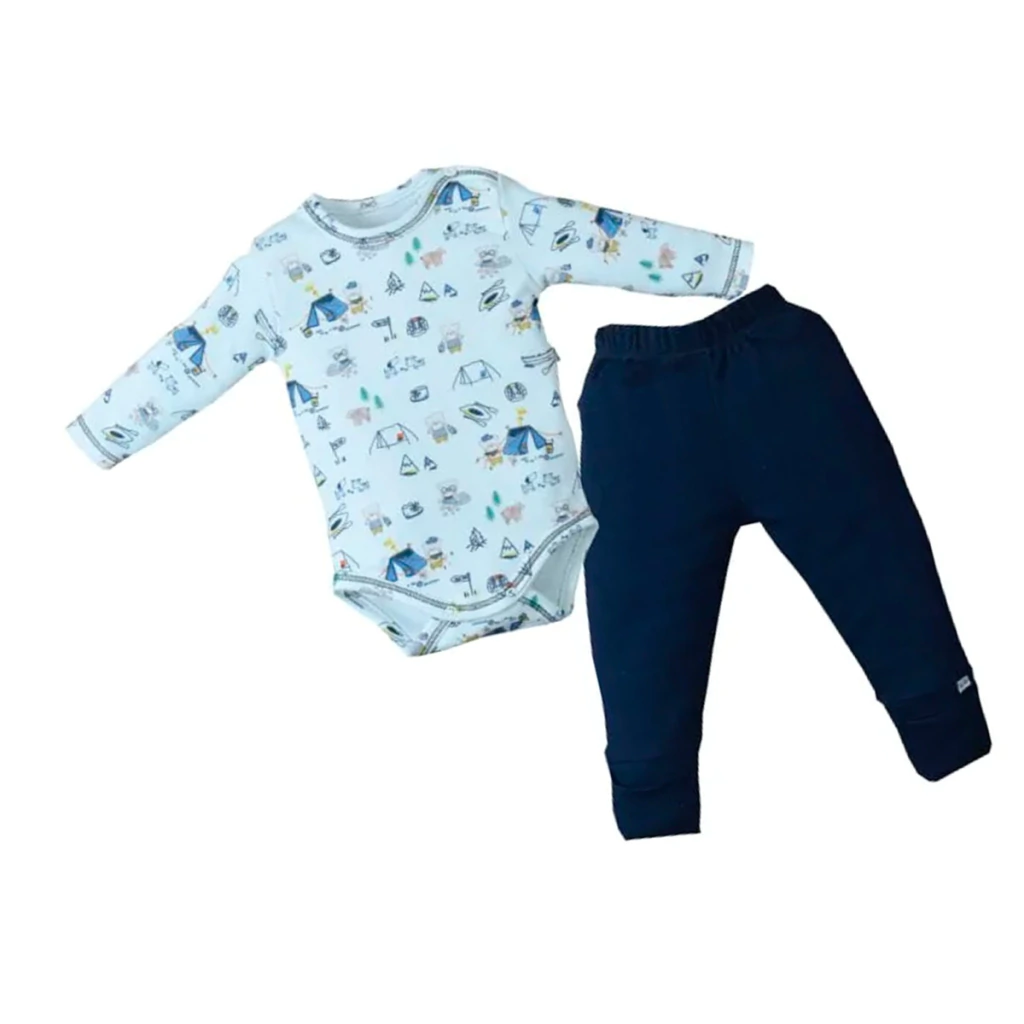 Escolha este conjunto azul marinho com estampa de camping, ideal para acompanhar o bebê em todas as suas aventuras com conforto e charme.