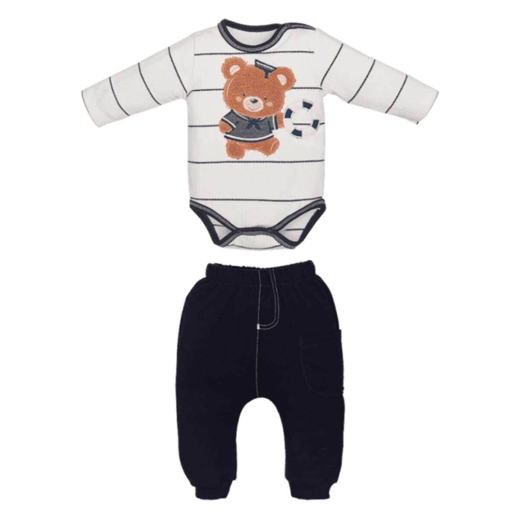 Conjunto perfeito para o bebê, composto por um body e uma calça, garantindo conforto e estilo para o dia a dia. A peça combina malha listrada e moletinho liso, com detalhes delicados e funcionais, tornando-a ideal para diversas ocasiões.