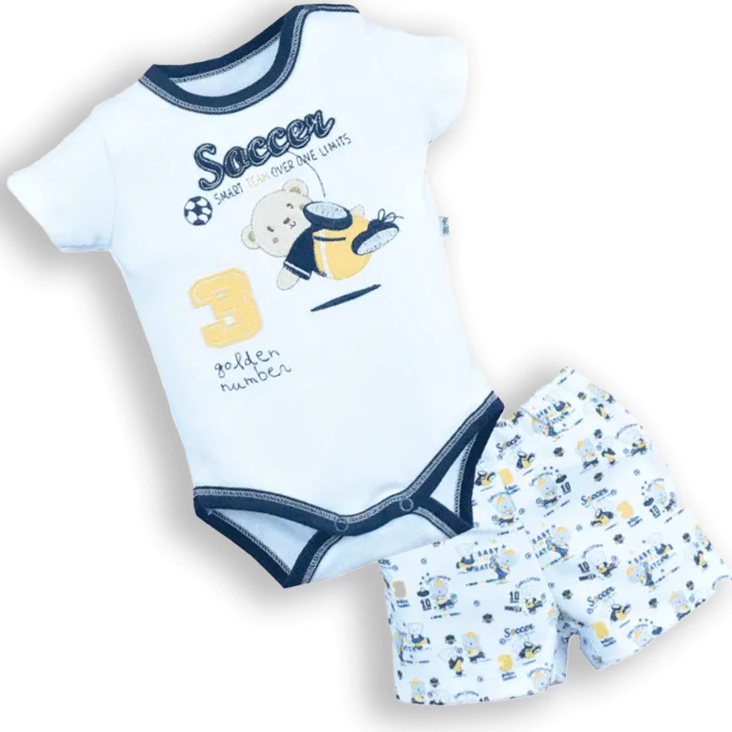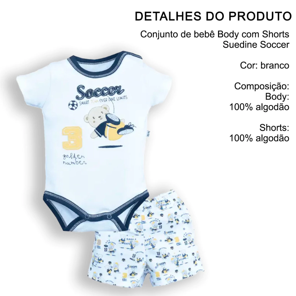 Escolha o Conjunto Body com Shorts Suedine Soccer para vestir seu bebê com conforto e um toque esportivo encantador.