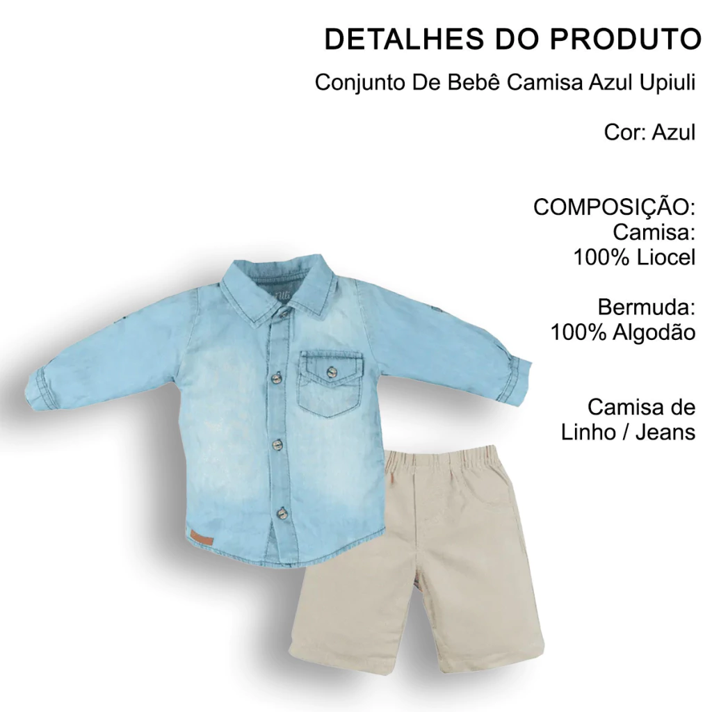 Este conjunto da Upi Uli é perfeito para ocasiões especiais ou passeios em família. A camisa em tecido tipo linho/jeans azul claro garante um look moderno e elegante, enquanto a bermuda bege em algodão proporciona liberdade de movimento.