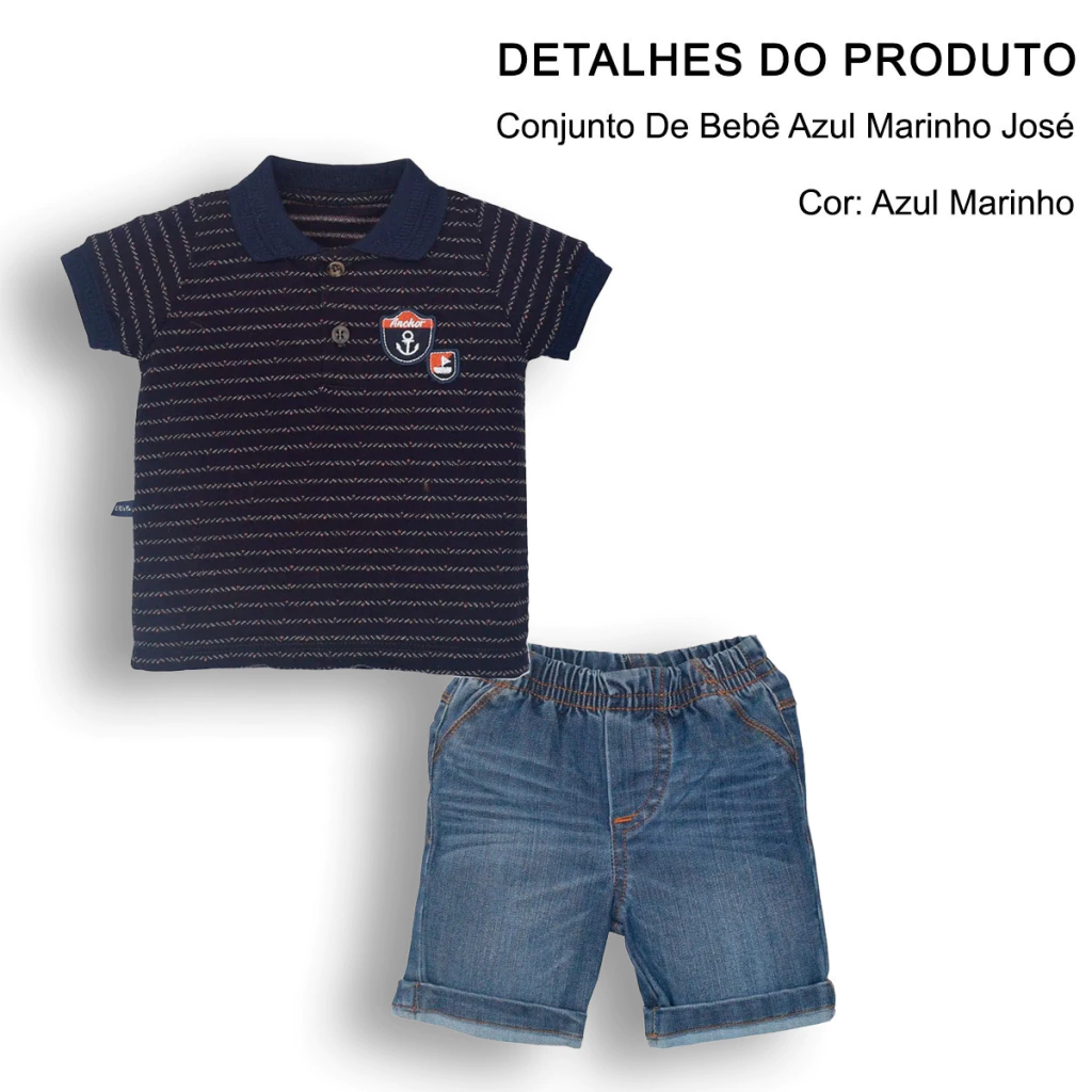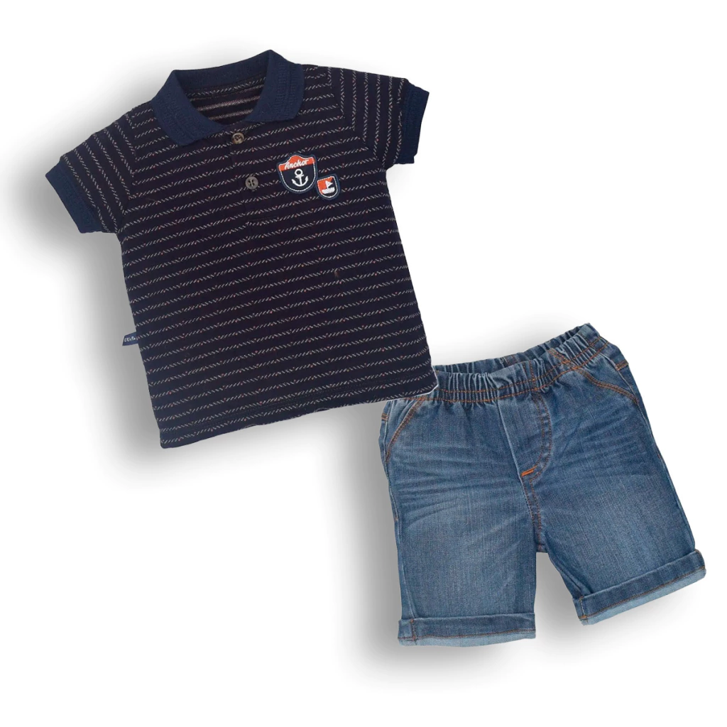 Estilo e frescor se unem neste conjunto encantador, ideal para os passeios mais charmosos do seu pequeno! A camiseta polo em piquet fio tinto traz um toque sofisticado com sua gola e punhos em retilínea azul marinho, além de um bordado delicado no peitinho. Já a bermuda em jeans com elastano garante liberdade de movimentos e conforto absoluto, com lavagem moderna que combina com qualquer ocasião.