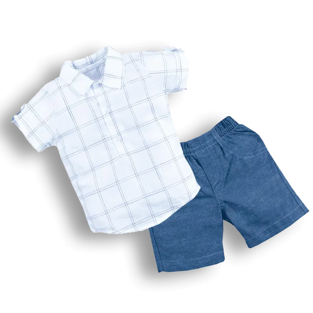 Este conjunto da Upi Uli une elegância e praticidade em uma peça versátil para diversas ocasiões. A camisa xadrez branca com detalhes azuis é leve e charmosa, enquanto a bermuda em tecido jeans proporciona liberdade de movimento com muito conforto.