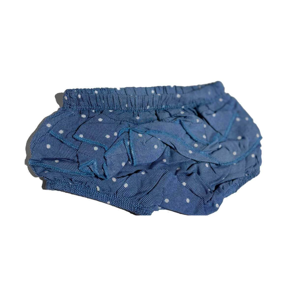 Tapa fralda azul marinho com estampa de poá (bolinhas brancas), combinando com a barra da camiseta para um visual harmonioso.