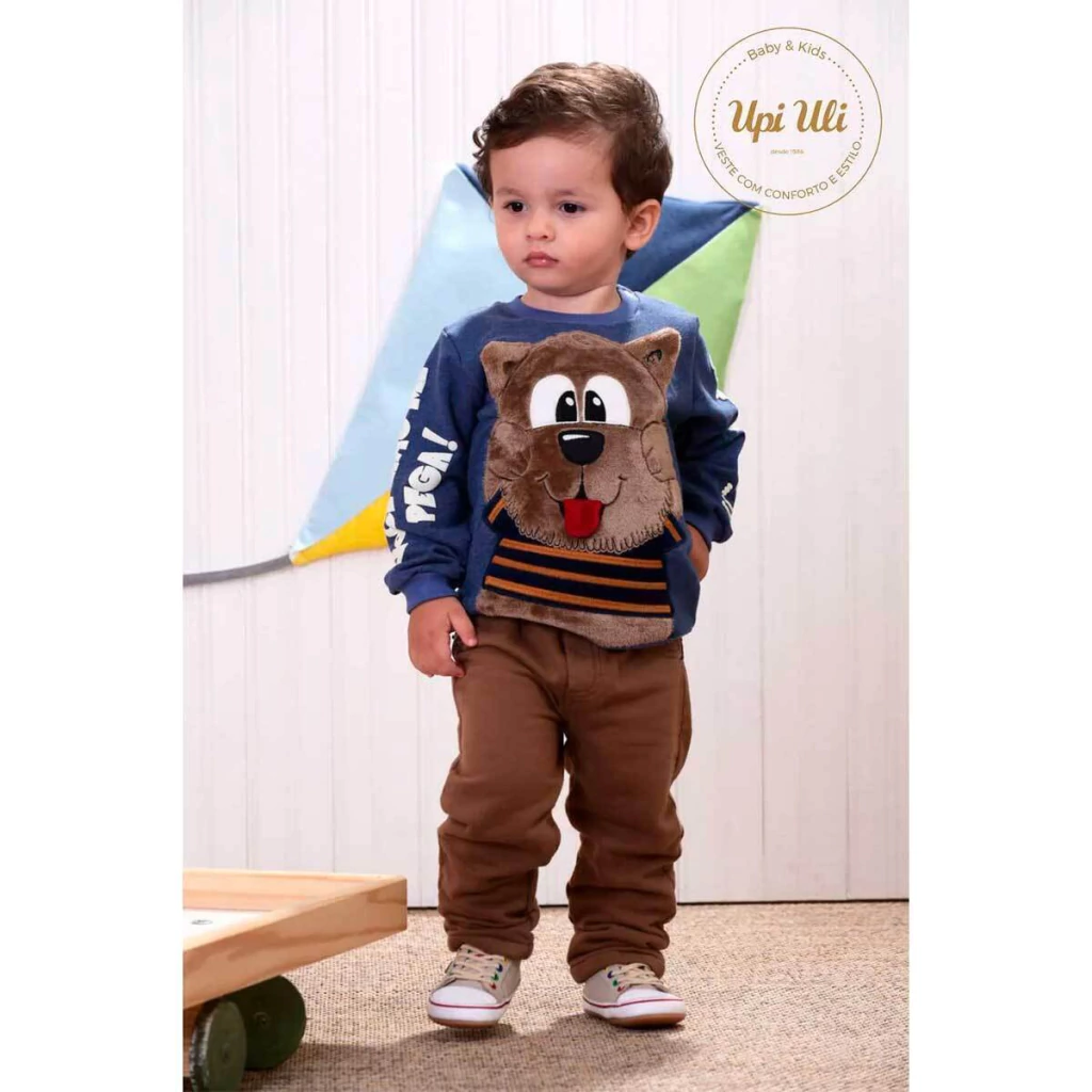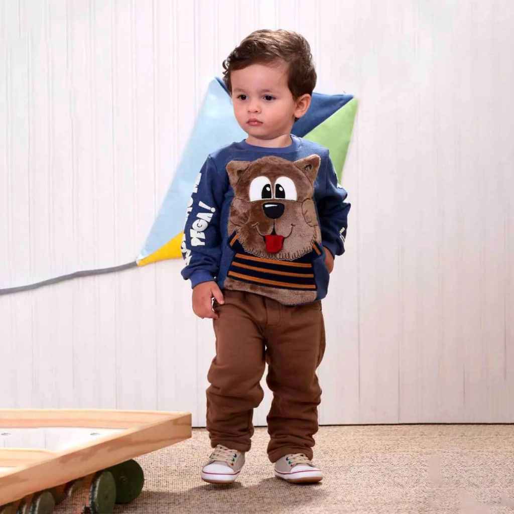 Calça em moletom na cor marrom, combinou super com o azul da blusa e o bordado na mesma cor marrom.