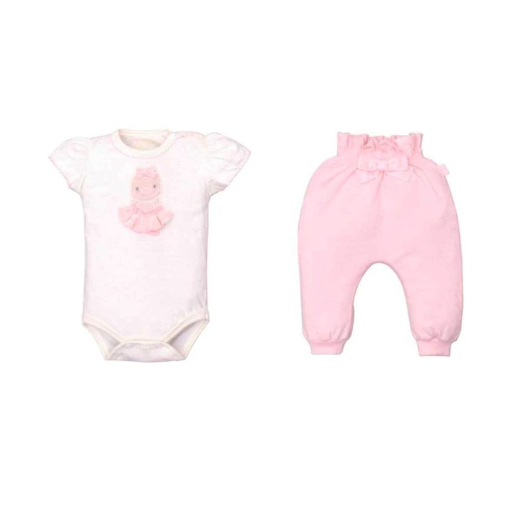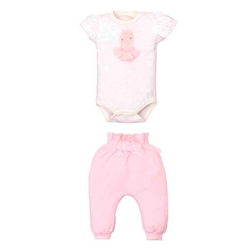 Encante-se com a delicadeza do Conjunto Body com Culote Rosa Maite da Upi Uli. Com visual romântico e cheio de charme, é a escolha ideal para deixar sua bebê confortável e ainda mais fofa no dia a dia. O body possui manga bufante com detalhe em babado, gola com pérolas bordadas e aplicação bordada de personagem com sainha. Já o culote tem cós alto com babado franzido e lacinho frontal, garantindo um visual gracioso e confortável.