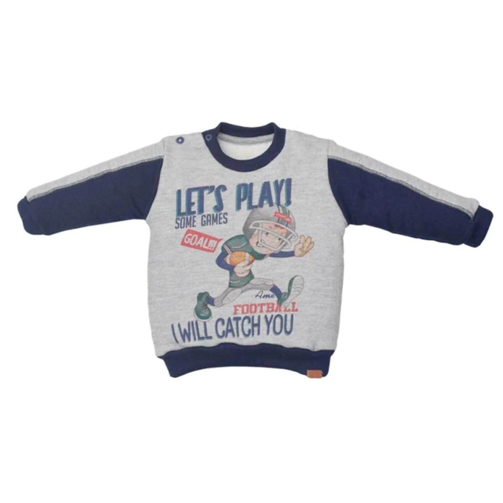 Esse conjunto é ideal para os dias mais fresquinhos, unindo conforto, praticidade e um visual esportivo super divertido. A blusa em moletom apeluciado flocado na cor cinza possui estampa digital (toque zero) com tema esportivo e recortes nas mangas que deixam o look moderno e descontraído. A calça também em moletom apeluciado azul marinho com laterais em cinza e elástico macio na cintura, proporciona ajuste confortável e liberdade para brincar à vontade.