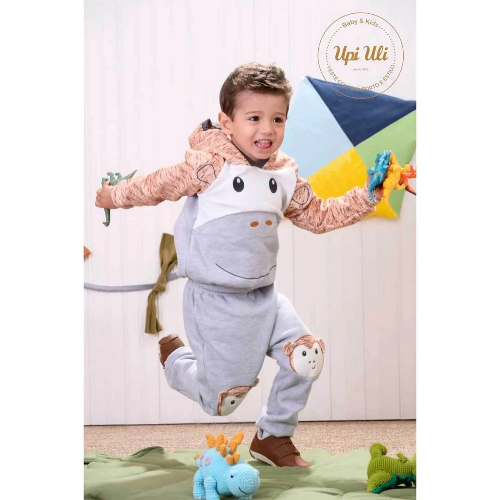 A calça é toda em moletom cinza, com bordado de macaquinho no joelho em relevo, pensam no charme que ficaria no baby boy!!!