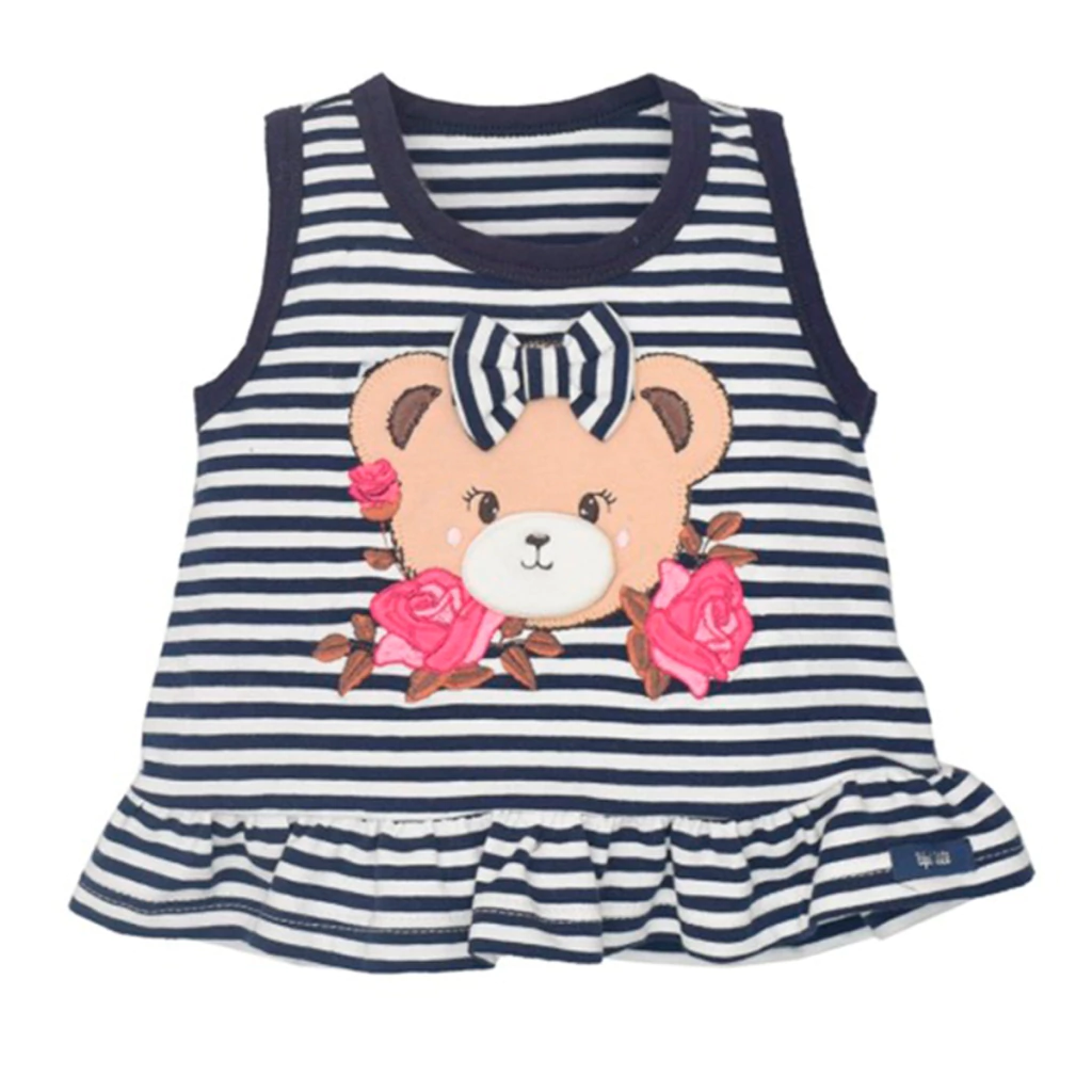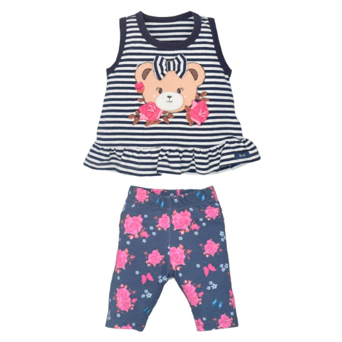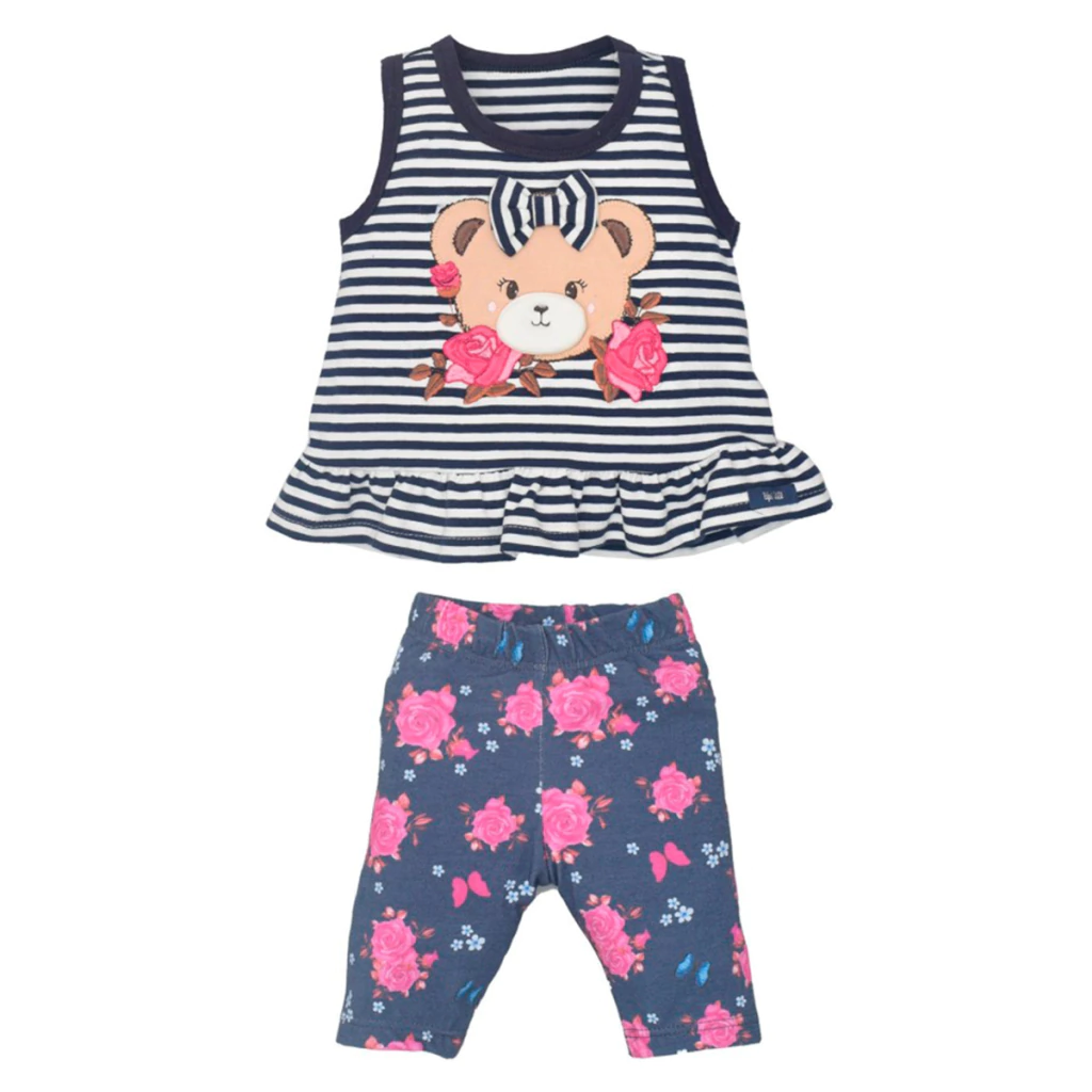 O Conjunto de Bebê Curto Azul Emanuelli é ideal para os dias mais quentes, combinando conforto com um visual encantador. A blusa regata em listrado azul marinho possui um delicado bordado de ursinha com aplicação em relevo, enquanto o short tipo legging traz uma linda estampa digital de rosas e borboletas. Um conjunto que une praticidade e estilo para a rotina da bebê.