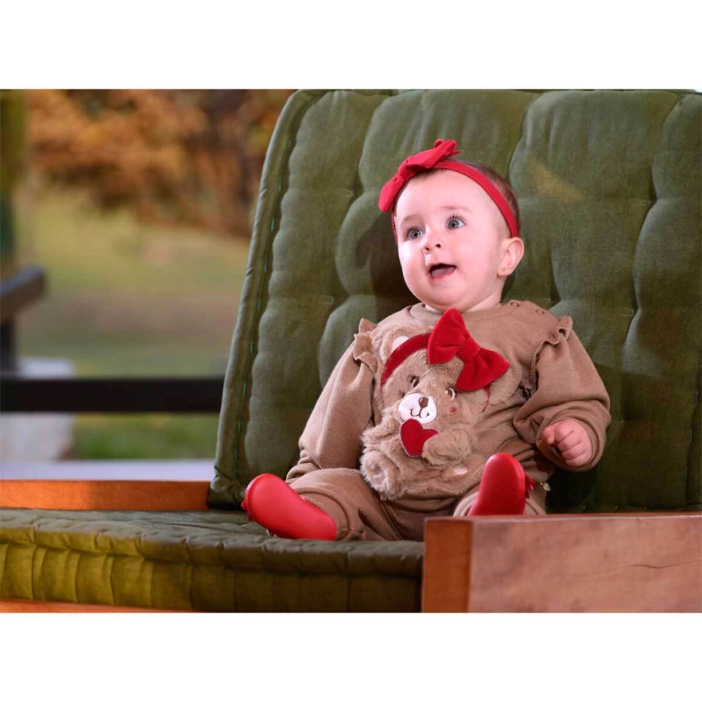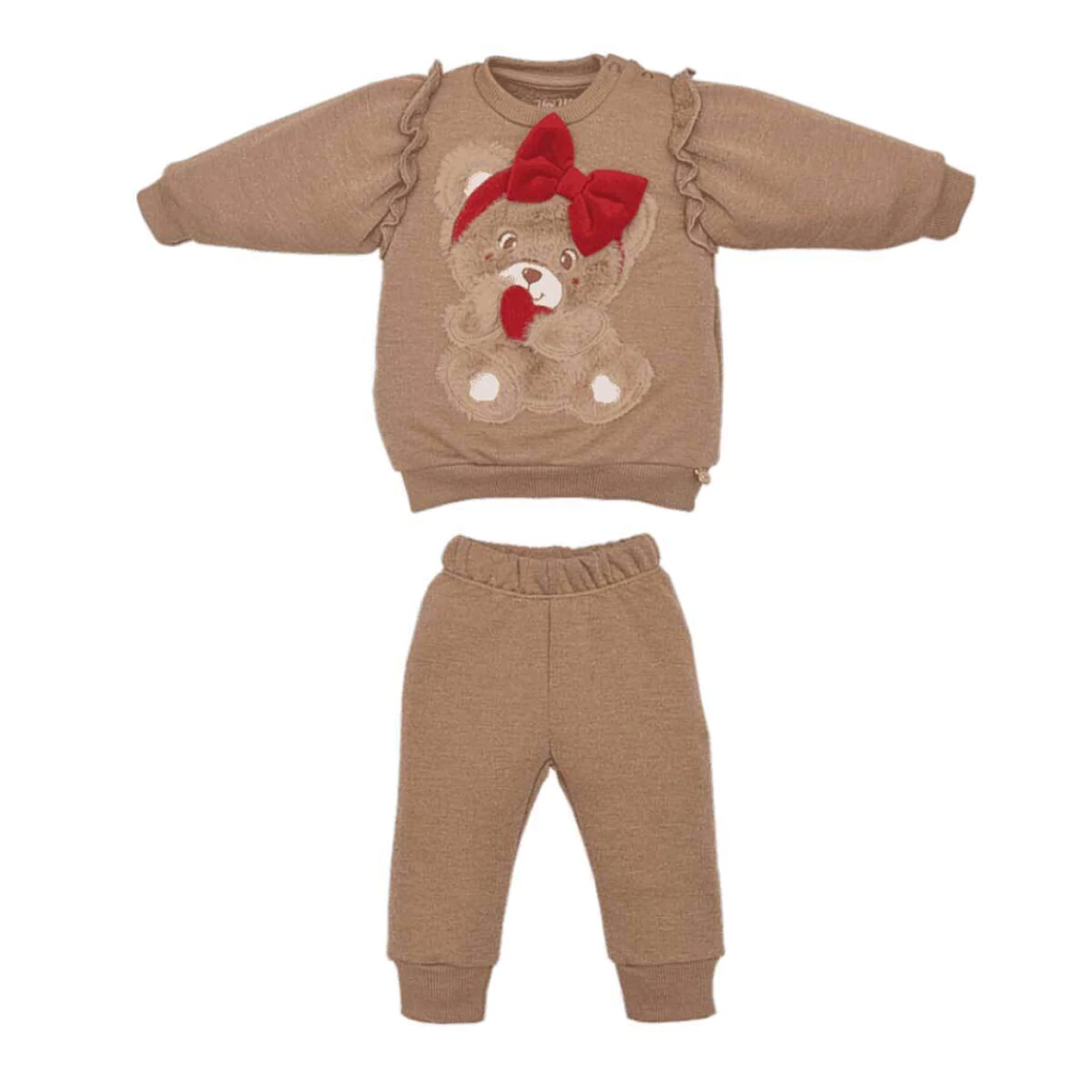 Este conjunto infantil, na cor marrom, é a escolha perfeita para conforto e estilo. A blusa em moletom sem felpa possui um leve brilho, com um delicado bordado de ursinha, e é ajustada com punhos na gola, mangas e barra. O tamanho P ao G possui abertura na gola com fechamento por botão de pressão, enquanto os tamanhos 1 ao 4 têm gola normal, sem abertura. A calça, também em moletom sem felpa e com leve brilho, tem cós com elástico embutido e barra com punho, garantindo ajuste perfeito e aconchego para o pequeno.