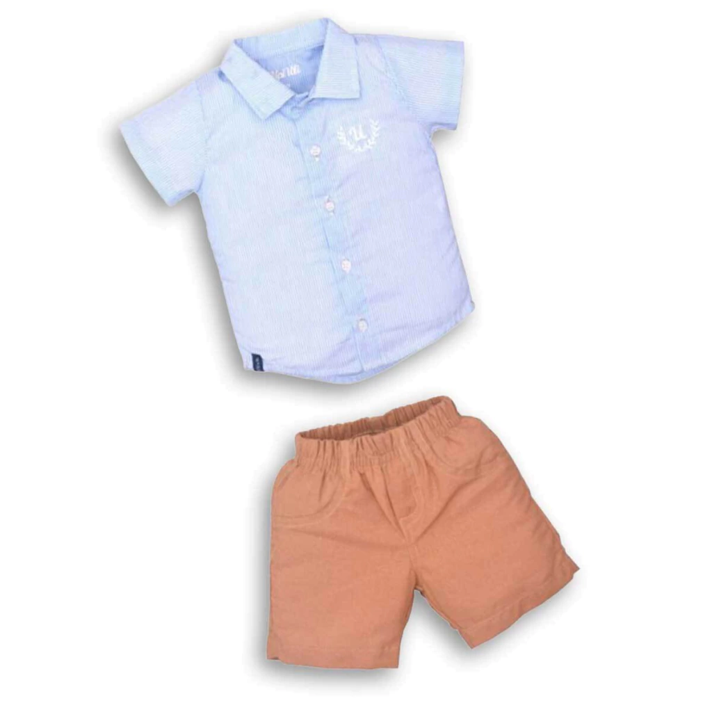 Conjunto elegante e confortável para meninos, ideal para ocasiões especiais. A camisa social azul claro possui listras brancas e fechamento por botões, garantindo um visual clássico e sofisticado. A bermuda marrom complementa o look com um toque moderno e ajuste confortável.