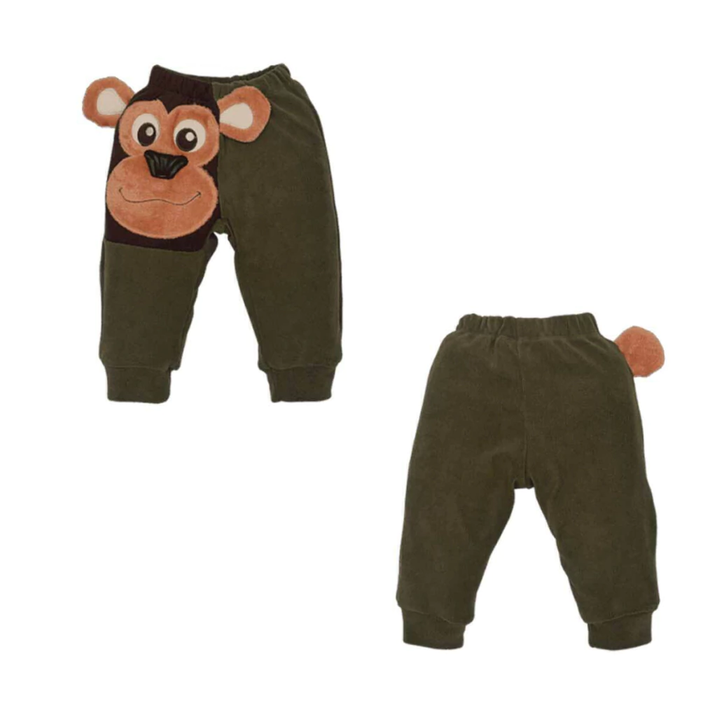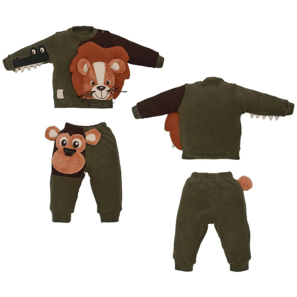 Conjunto em fleece quentinho e macio, perfeito para manter o bebê confortável e aquecido. A blusa possui bordado lateral frontal de leão e bordado de jacaré na manga com detalhes em 3D, tornando a peça cheia de charme e diversão. A calça, também em fleece, apresenta bordado de gorila e um ajuste confortável com cós elástico e barra com punho.