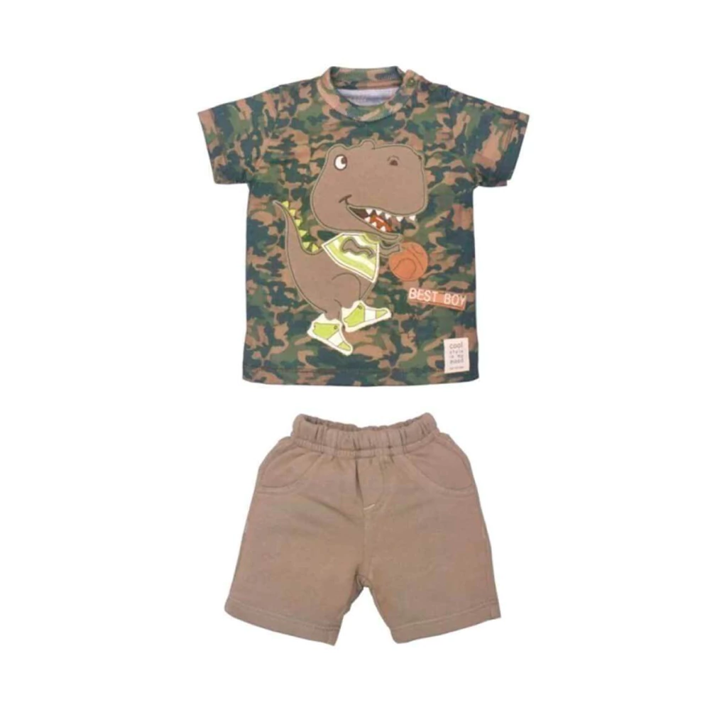 O Conjunto Camiseta e Short Suedine traz um visual cheio de estilo e conforto para os pequenos exploradores. A camiseta com estampa militar e um dinossauro frontal divertido dá um toque aventureiro ao look, enquanto o short marrom complementa com versatilidade. Feito em suedine macio e respirável, é ideal para o dia a dia e momentos de diversão.