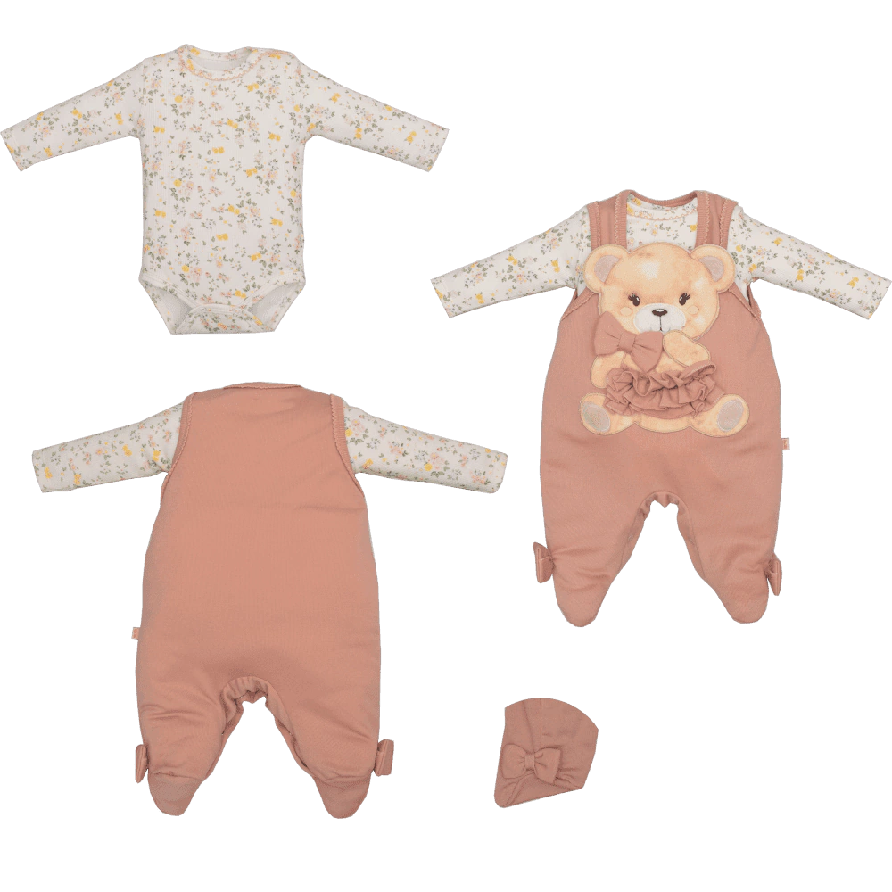 O Conjunto Jardineira com Body Bebê Menina Esther é a escolha perfeita para compor um look delicado e cheio de charme para sua pequena. Com um design encantador e detalhes fofos, como o bordado de ursinha com laço e a estampa floral, essa combinação une conforto e estilo, ideal para o dia a dia ou ocasiões especiais.