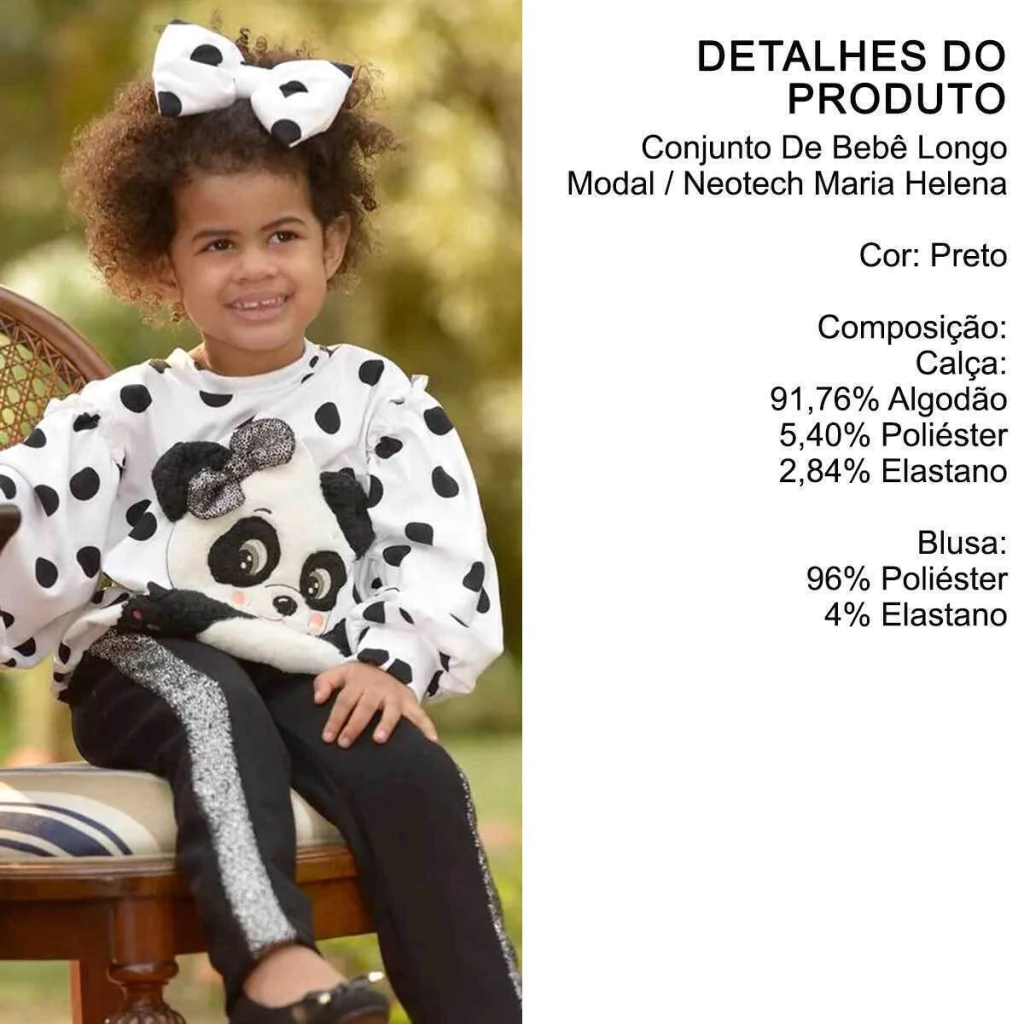 Esse conjunto é a definição de charme para os dias frios! A blusa branca em tecido modal com elastano traz estampa em poá e um bordado encantador de ursinha panda com aplicação em pelúcia e lacinho brilhante, perfeita para brilhar nos passeios. A calça preta em tecido neotech tem brilho nas laterais e elástico confortável na cintura, garantindo estilo e liberdade de movimentos. Um look completo, moderno e confortável para sua pequena arrasar!