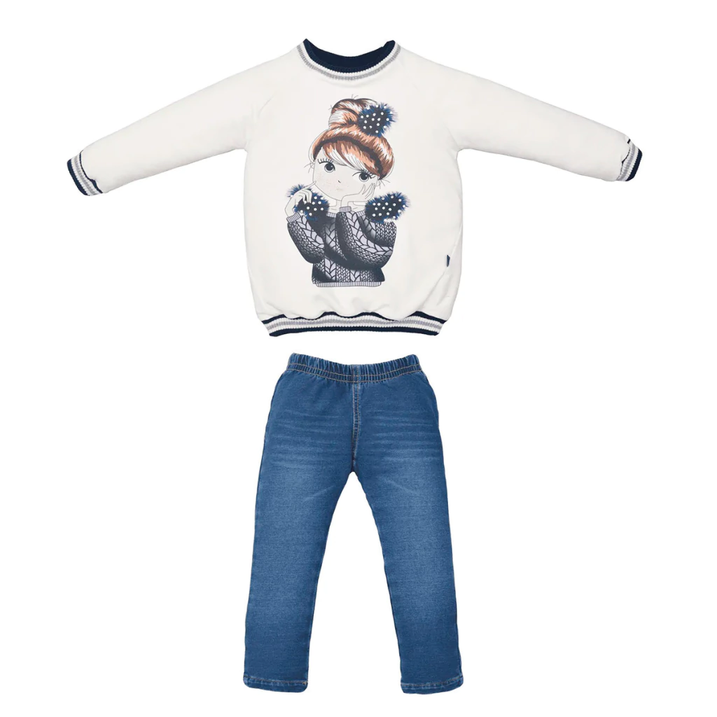 Preparem os coraçãozinhos para lidar com esse docinho que é esse conjunto! Ideal para os dias mais frios, ele traz conforto extremo com muito charme. A blusa, feita em soft comfort apeluciado, conta com elastano que garante um toque macio e quentinho, além de uma estampa localizada de uma menina charmosa, aplicada em tecnologia digital com detalhes em retilíneas de algodão nas cores marinho, prata e marfim. Para completar, a legging em jeans com elastano oferece liberdade nos movimentos e muito estilo, formando um look harmonioso e cheio de delicadeza.