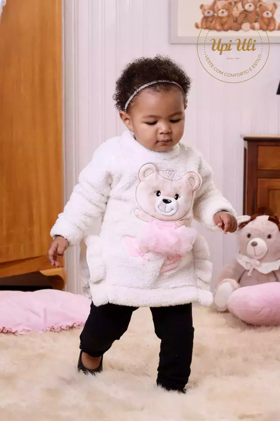 Composto por uma blusa toda em pelúcia, bordado em relevo lindo de ursinha bailarina com vestidinho em tule, bochechas com detalhes em glitter, um verdadeiro encanto!!